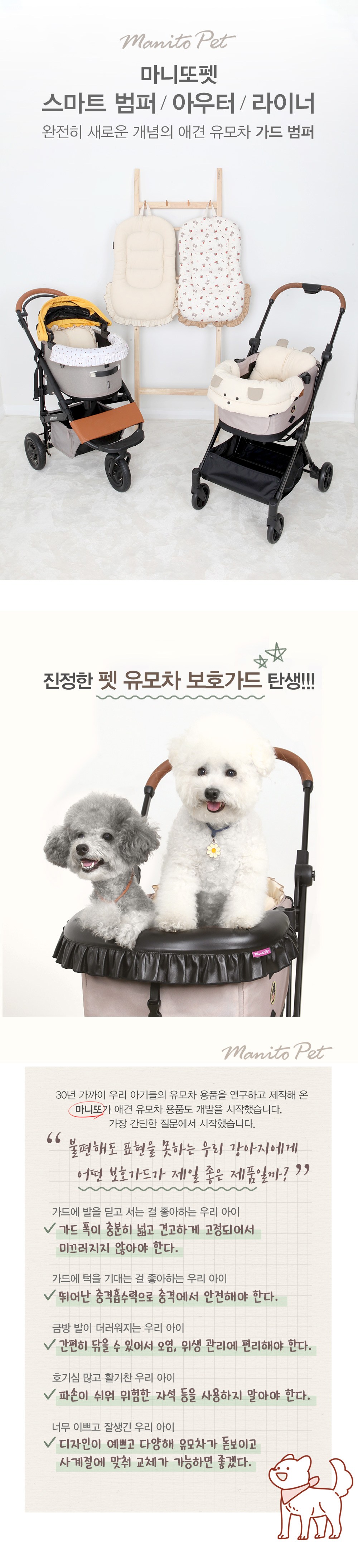 Manito Pet智能緩衝墊系列,為您的愛犬提供更安全舒適的外出體驗。智能防撞條採用寬敞設計,讓狗狗可以安心站立,欣賞沿途風景。內置吸震材質,有效吸收路面衝擊,保護寵物免受傷害。表面採用TPU塗層,易於清潔,方便衛生管理。多樣化的設計風格,可根據喜好選擇,為您的寵物推車增添時尚感。