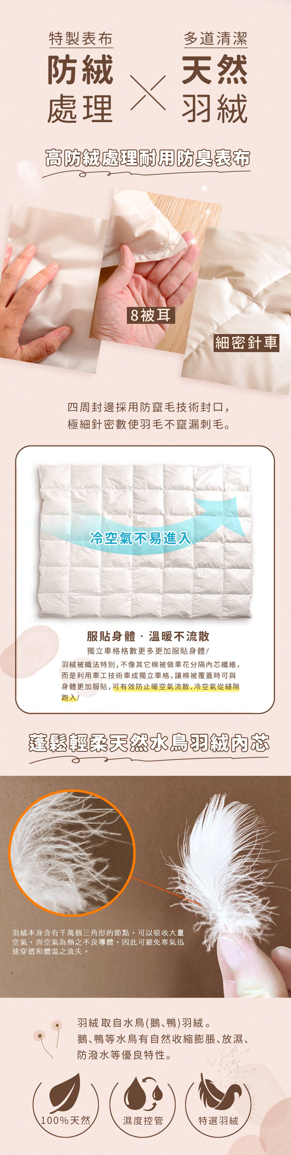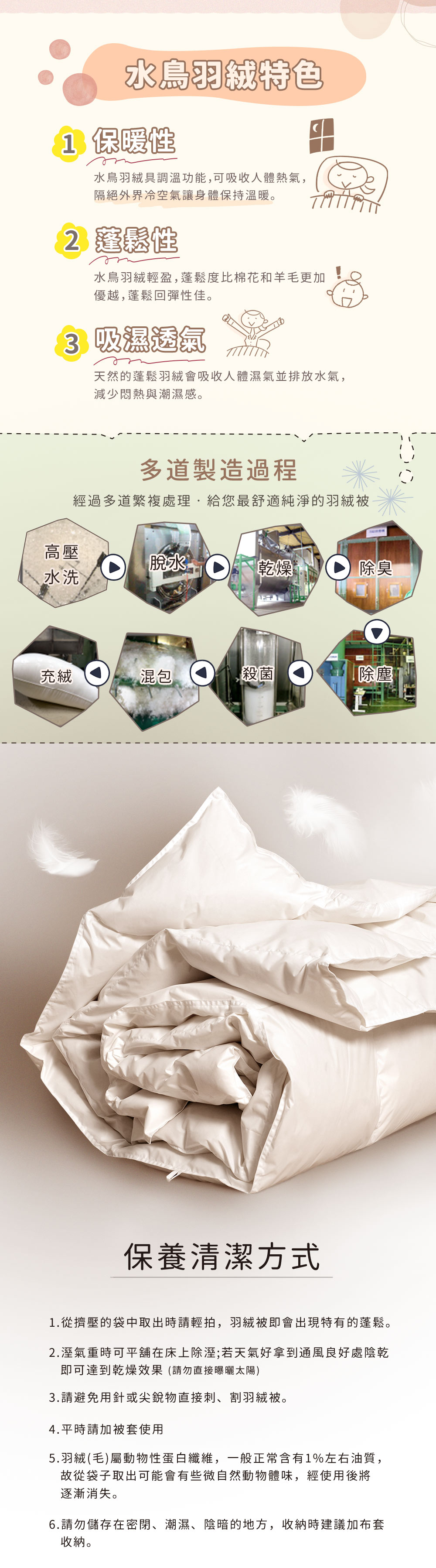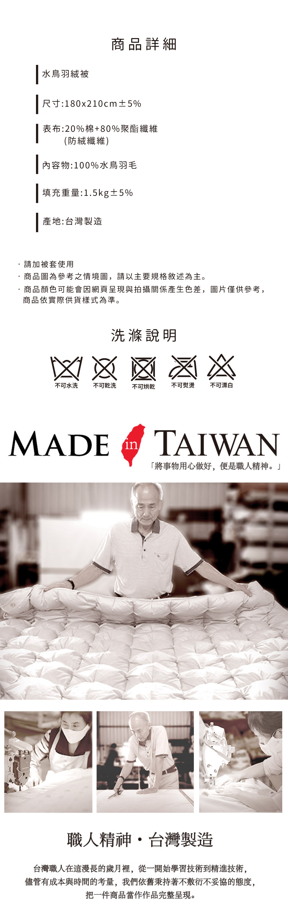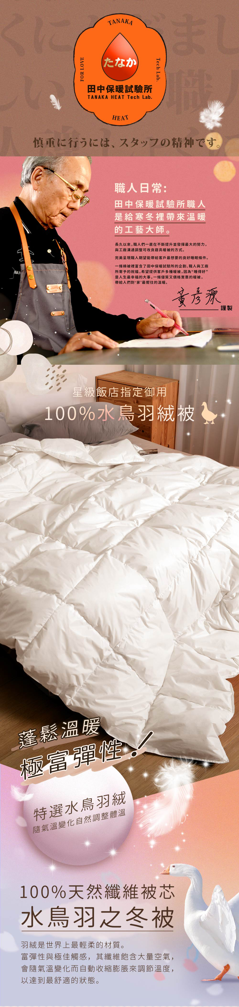 這款田中保暖水鳥羽絨被,台灣製造,為您帶來雙人7 x 6尺的溫暖呵護。嚴選100%水鳥羽毛填充,輕盈蓬鬆,具有極佳的保暖性和透氣性,讓您在寒冷的冬天也能享受舒適睡眠。面料採用20%棉+80%聚酯纖維,經過防絨處理。此款冬被不宜水洗、乾洗、烘乾、熨燙或漂白,建議定期暖曬以保持乾燥和蓬鬆度。讓這款高品質的羽絨被,為您打造一個溫暖舒適的冬夜。