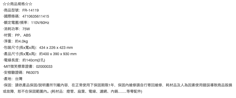 百威14吋立扇,型號FR-14119,為您帶來涼爽舒適的夏日體驗。這款立扇採用三片扇葉設計,提供三段風速調節,滿足不同環境下的需求。黑色外觀簡約時尚,尺寸為930 x 400 x 390mm,重量僅4kg,方便移動。立扇具備擺頭功能,可調整傾斜角度,確保室內空氣循環流通。產品符合MIT微笑標章認證,品質有保障,一年保固讓您安心使用。