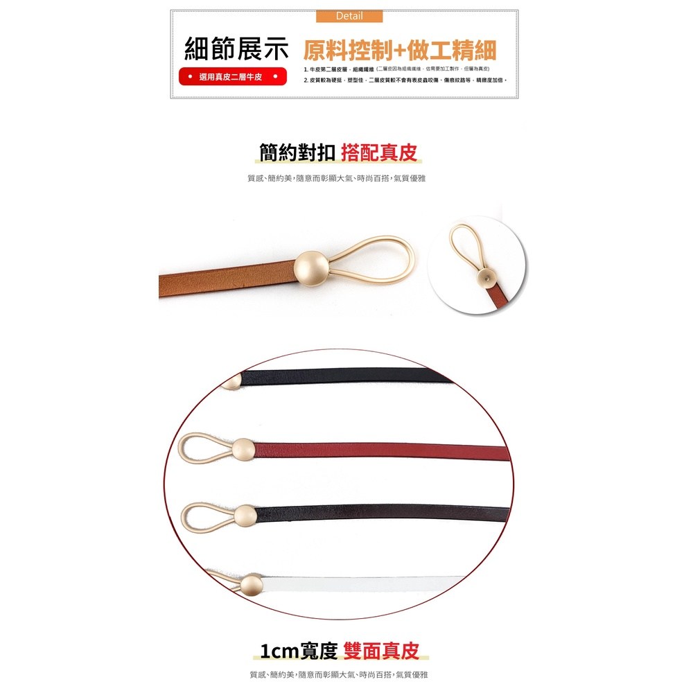 這款真皮牛皮腰帶,寬度僅1公分,為女士們打造精緻細腰的時尚配件。咖啡色的優雅色調,搭配105公分的長度,適合各種身形的女性。採用高品質牛皮材質,不僅耐用且觸感舒適,展現您的品味與質感。簡約的打結設計,無需打孔即可輕鬆調整,方便快捷。無論是搭配裙裝或褲裝,都能為您的造型增添亮點,展現獨特魅力。