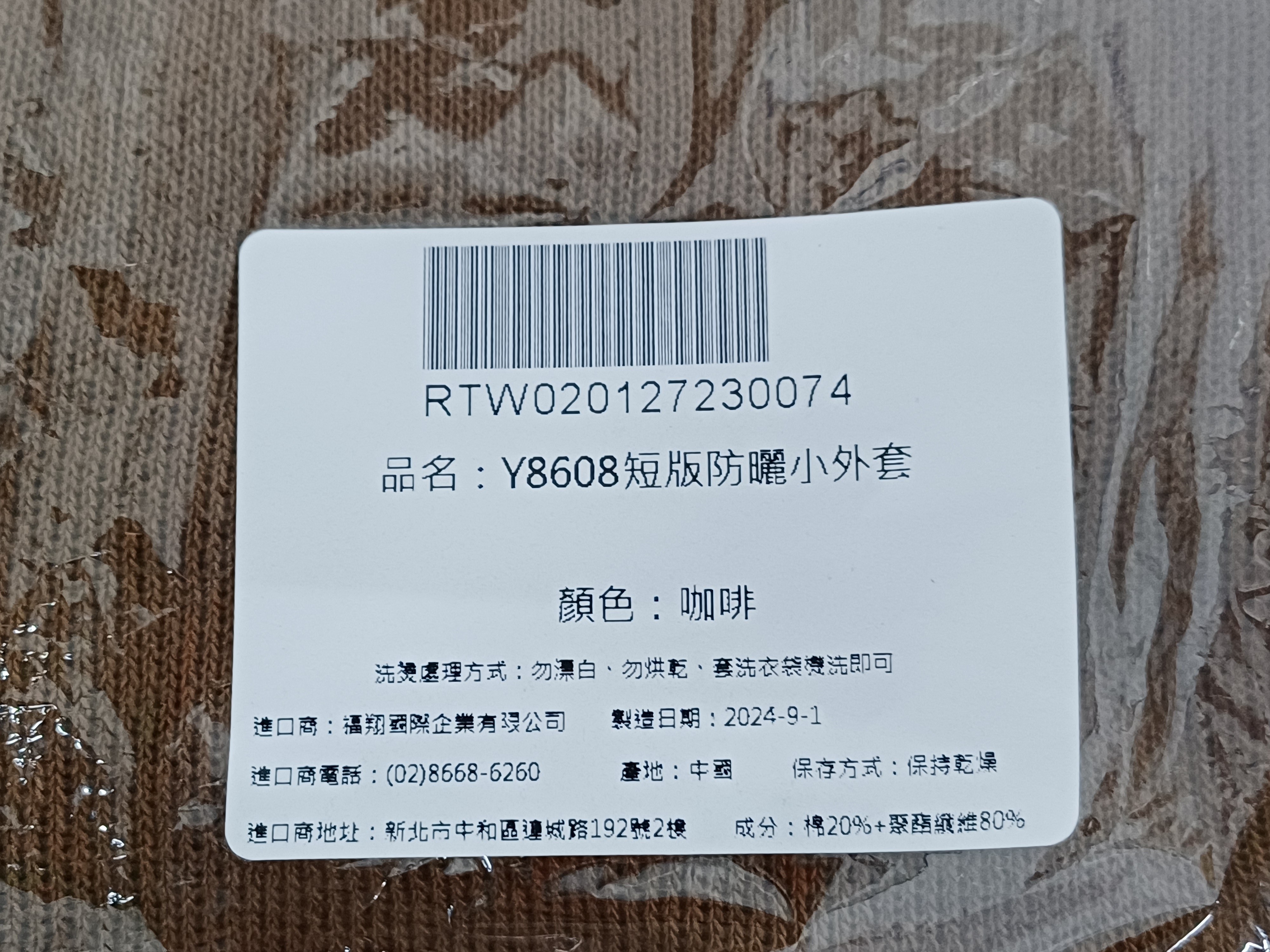 這款咖啡色短版防曬小外套,是您夏日戶外活動的理想選擇。採用棉20%+聚酯纖維80%的材質,輕薄透氣,有效阻擋紫外線。短版設計時尚百搭,無論搭配裙裝或褲裝,都能展現您的個人魅力。洗滌方便,只需套洗衣袋機洗即可,省時省力。無論是日常穿搭還是度假休閒,這款小外套都能讓您在享受陽光的同時,保持美麗與自信。