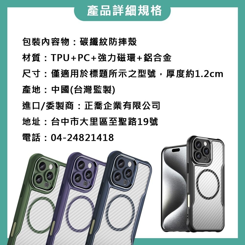 這款適用於 iPhone 16 Plus 的碳纖紋防摔殼,以軍墨綠配色展現您的獨特風格。採用 TPU+PC 材質,結合強磁環與鋁合金,提供卓越的耐用性和防摔保護,讓您的手機免受日常碰撞和摔落的損害。碳纖紋設計不僅增添了時尚感,還能有效提升握持感。精準的孔位設計確保所有按鈕和接口都能輕鬆使用,無線充電功能不受影響。選擇這款兼具保護與時尚的軍墨綠碳纖紋防摔殼,為您的 iPhone 16 Plus 提供全方位的守護。