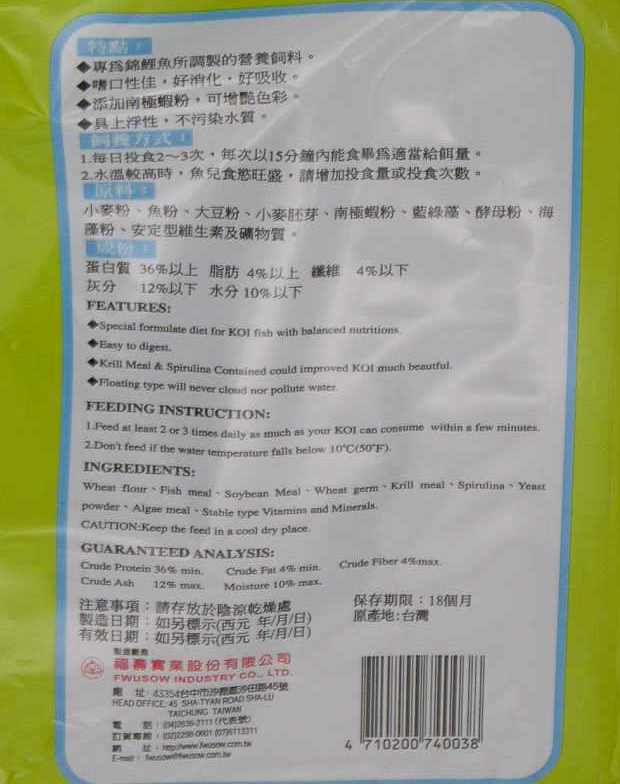福壽錦鯉揚色魚飼料,專為提升錦鯉色彩而設計的營養飼料。本產品採用特殊配方,富含蛋白質、脂肪、纖維等多種營養成分,有助於錦鯉健康成長,並增強其體色鮮豔度。飼料中添加了南極蝦粉和螺旋藻,能有效增強錦鯉的自然色彩,使其更加美麗動人。本產品為浮上性飼料,不易污染水質,讓您的愛魚在清潔的環境中健康成長。每日餵食2-3次,每次以15分鐘內能食畢為宜,水溫較高時,可適量增加餵食量或次數。