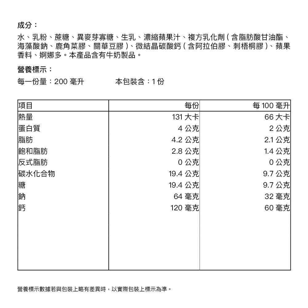 | 成分(牛肉/豬肉需單獨標明來源國) | 水、乳粉、蔗糖、異麥芽寡糖、生乳、複方乳化劑(脂肪酸甘油酯、海藻酸鈉、鹿角菜膠、關華豆膠)、蘋果濃縮汁、複方營養添加劑(碳酸鈣、羧甲基纖維素鈉、阿拉伯膠、刺梧桐膠、蘋果香料、婀娜多(紅木種子萃取物) | 製造商或國內負責商名稱 | 佳格食品股份有限公司 |