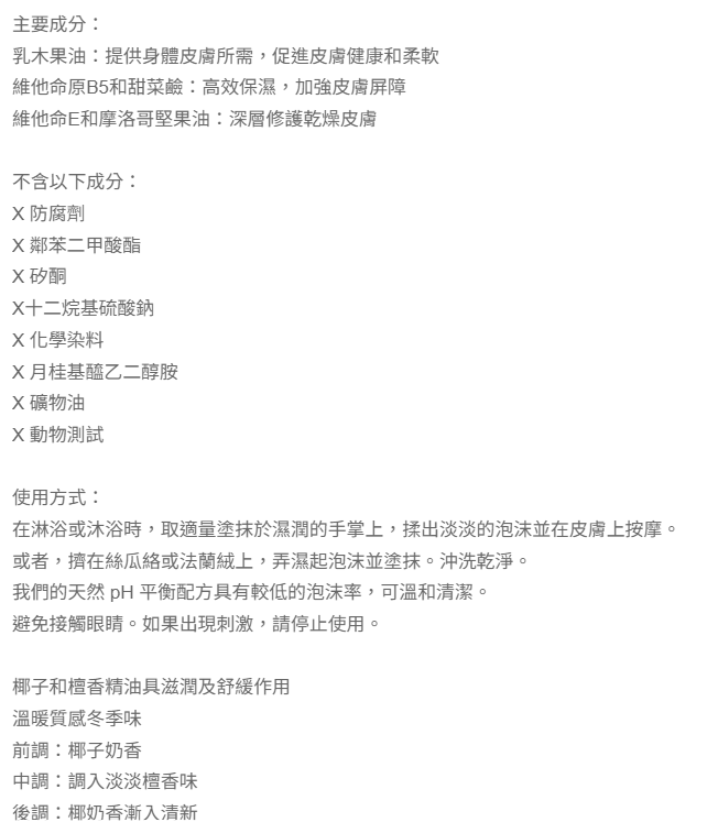 - 椰子檀香沐浴露,滋潤乾燥肌膚,洗後肌膚柔嫩光滑,散發迷人光澤。