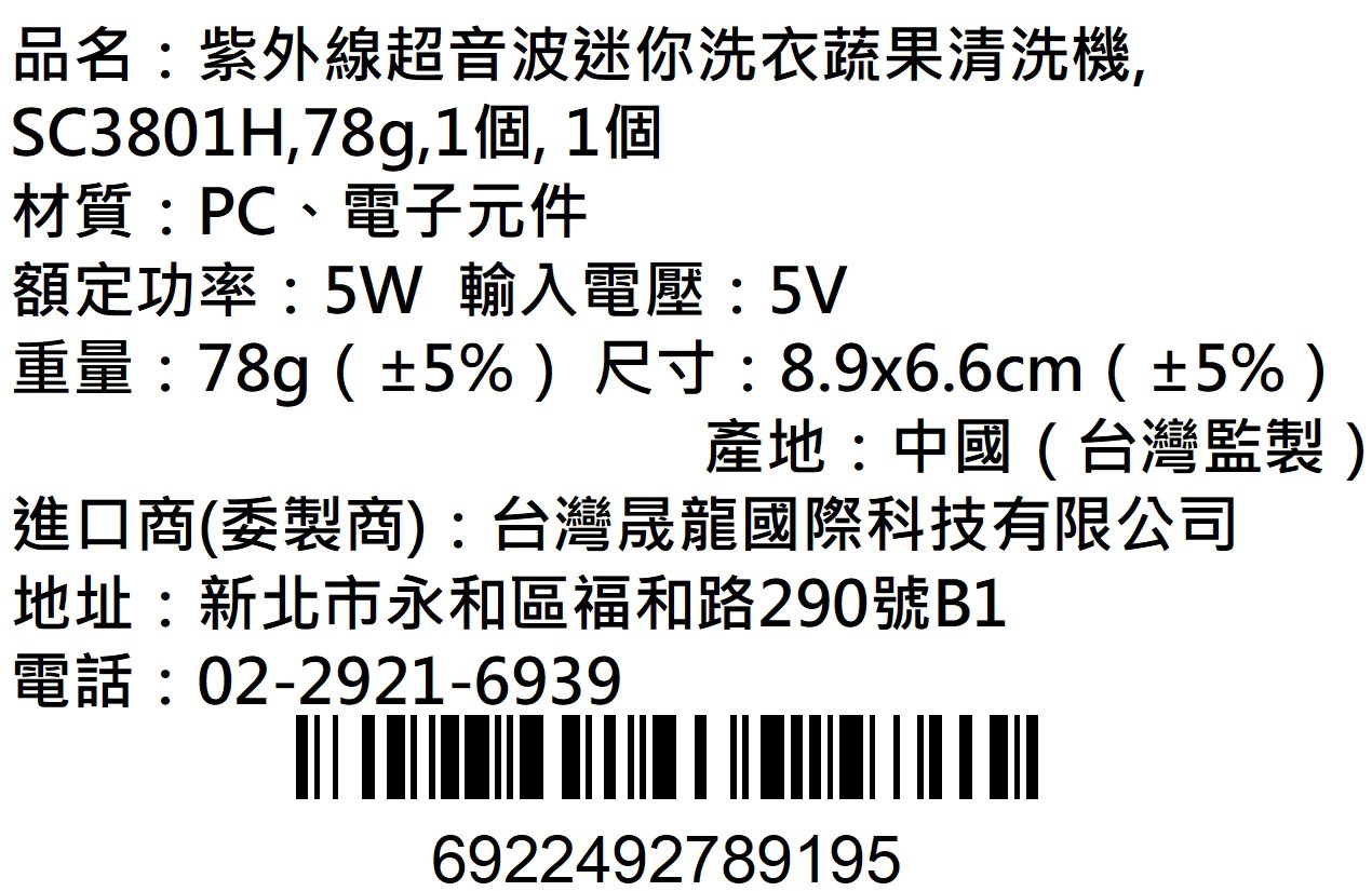 這款紫外線超音波迷你洗衣蔬果清洗機,型號SC3801H,重量僅78克,小巧輕便,讓您輕鬆享受健康生活。它採用先進的超音波技術,能有效去除蔬果表面的污垢和農藥殘留,讓您和家人吃得更安心。此外,它還可以用於清洗貼身衣物,避免交叉感染,呵護您的健康。這款清洗機操作簡單,只需將其放入水中,即可自動清洗,省時省力。讓這款多功能清洗機成為您健康生活的得力助手!