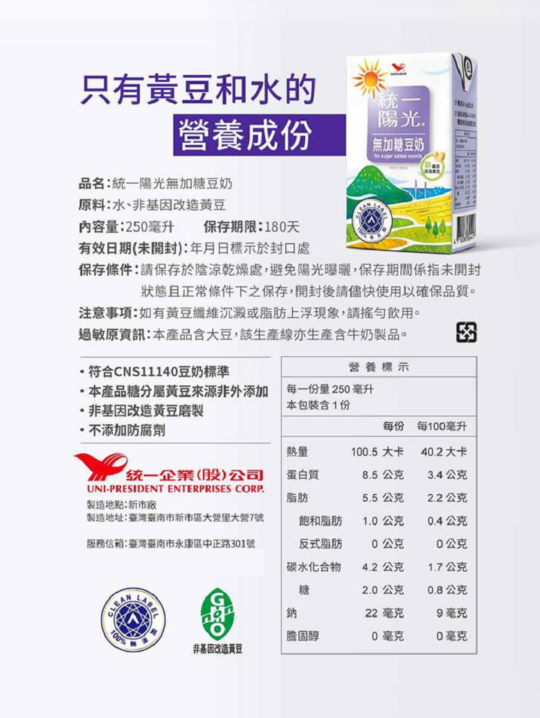- 統一陽光無加糖豆奶,口感香醇濃郁,隨時享受健康美味,讓您活力充沛。