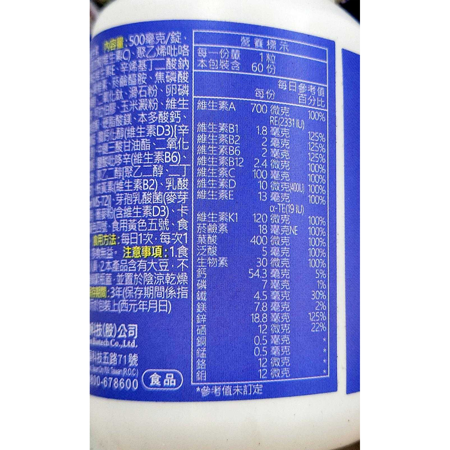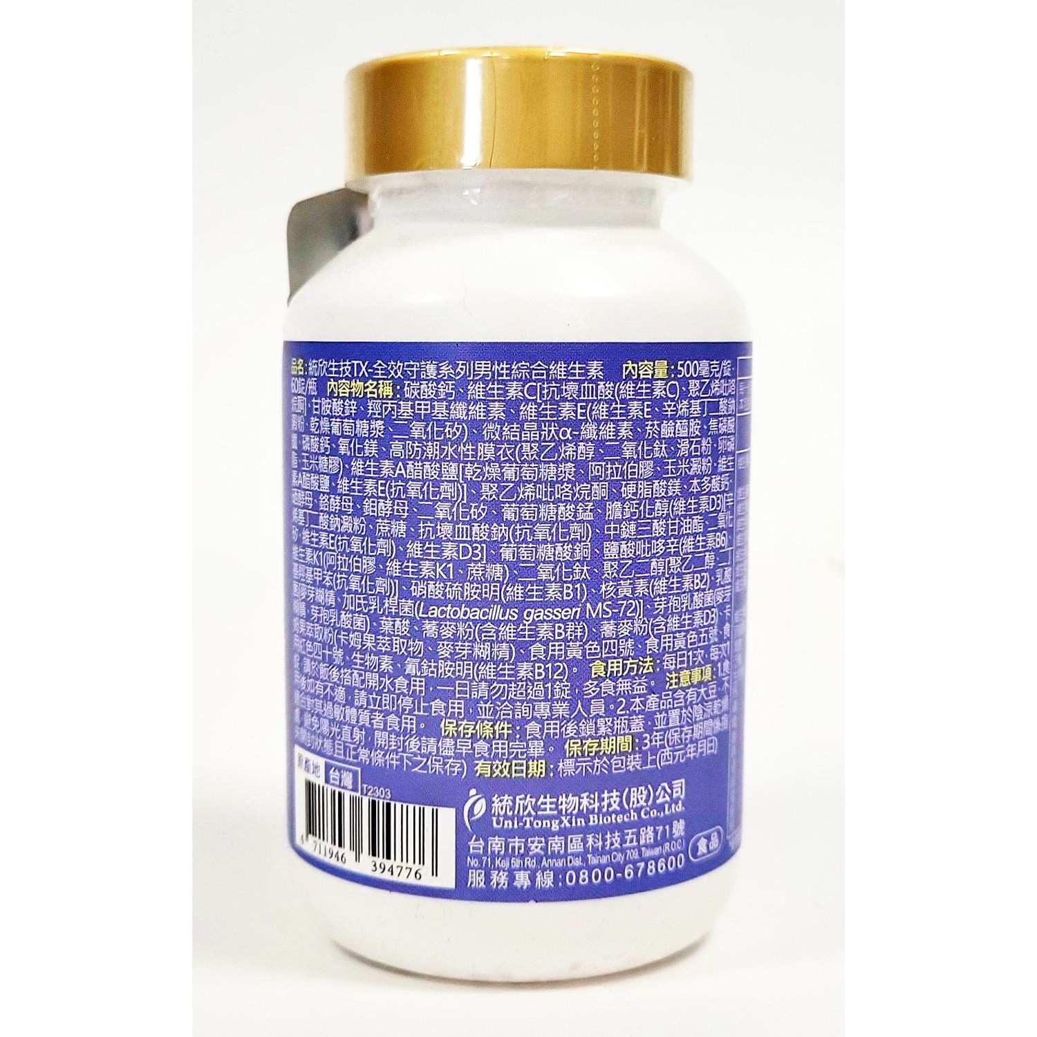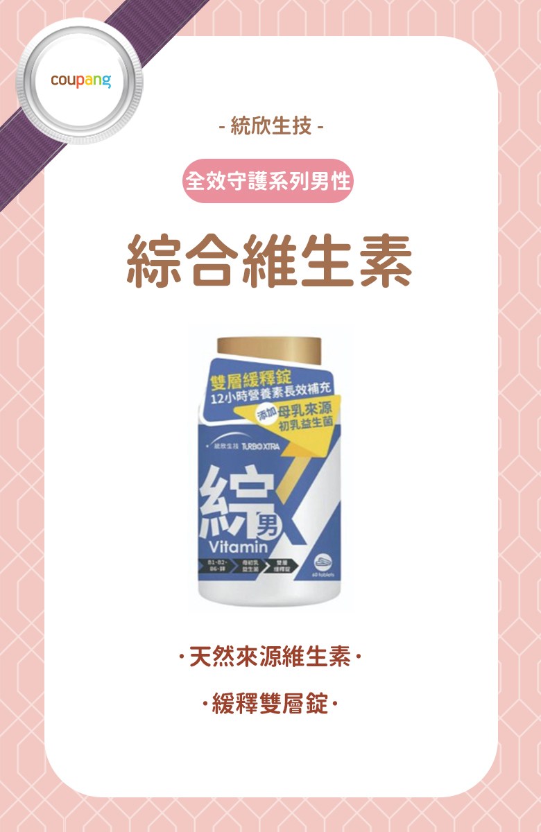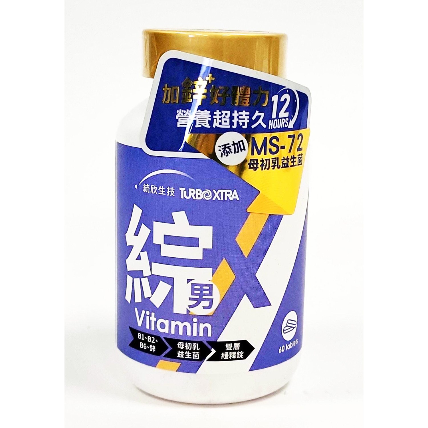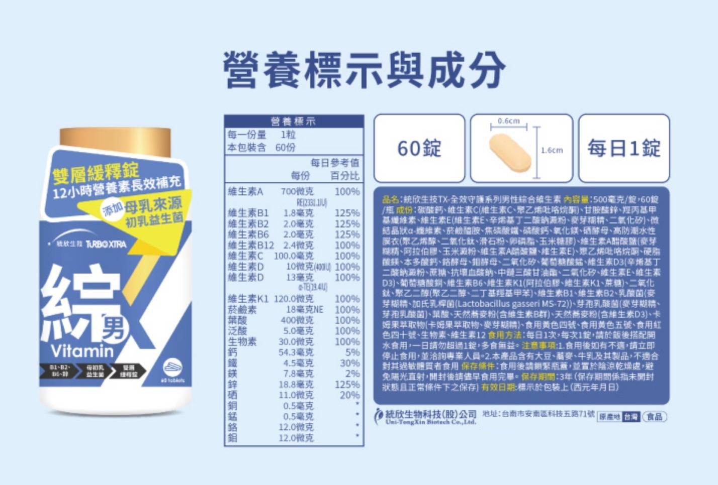 統欣生技TX全效守護系列男性綜合維生素,專為男性設計,提供每日所需的完整營養。每瓶含60錠,採用雙層緩釋錠技術,確保12小時長效營養補充,讓您精力充沛一整天。本產品特別添加母乳來源的MS-72初乳益生菌,有助於維持消化道機能,提升保護力。本產品含有多種維生素,包括維生素A、B群、C、D、E、K1等,以及多種礦物質,如鋅、鐵、鈣等,有助於維持身體正常機能。每日一錠,飯後搭配開水食用,讓您輕鬆補充所需營養,維持健康活力。