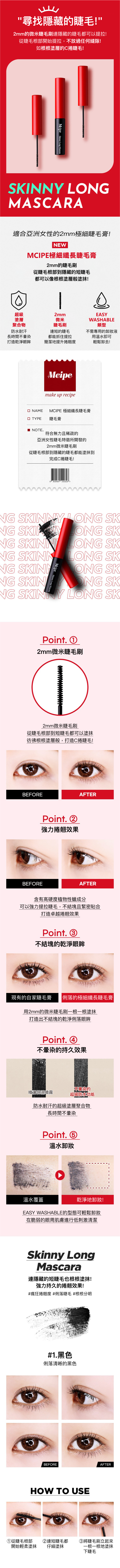 Mcipe極細纖長睫毛膏,專為亞洲女性設計的2mm極細刷頭,能深入睫毛根部,連細小睫毛也能完美提拉,打造根根分明的C型捲翹效果。超級塗層聚合物具備防水耐汗功能,能長時間維持不暈染的乾淨眼妝。溫水即可輕鬆卸除,不需使用專用卸妝產品,呵護脆弱的眼周肌膚。告別厚重結塊,展現自然纖長的迷人睫毛,讓妳的雙眼更加明亮動人。