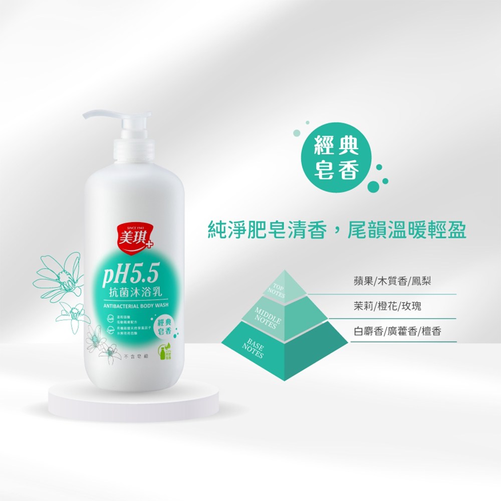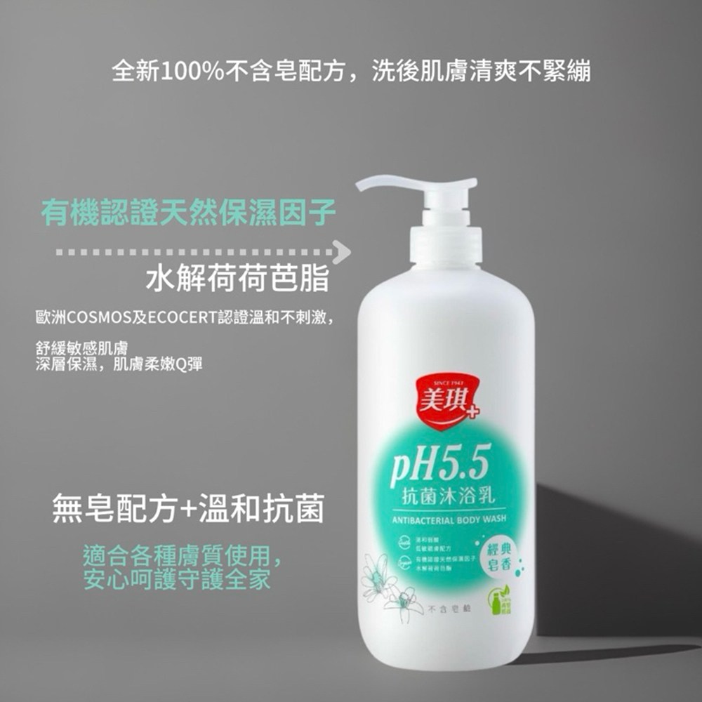 美琪 PH5.5 抗菌沐浴乳,溫和潔淨,呵護全家肌膚。此款沐浴乳採用 pH5.5 弱酸性配方,與肌膚酸鹼值相近,溫和親膚,洗後不緊繃。無皂鹼配方,不含色素及 MI/MCI 防腐劑,敏感肌也能安心使用,深層滋潤,使肌膚柔嫩 Q 彈。經典皂香,清新宜人,給您帶來舒適沐浴體驗。
