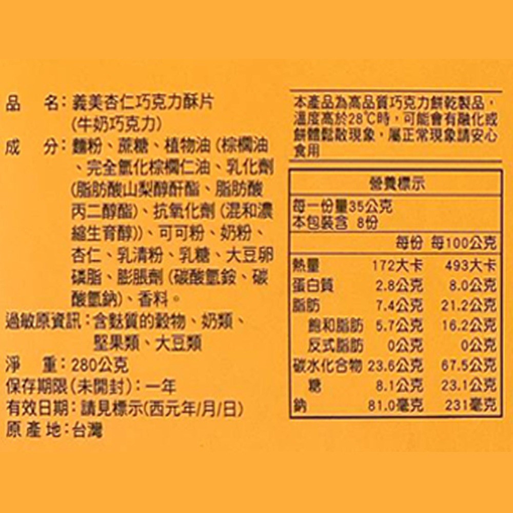 義美杏仁巧克力酥片,濃郁牛奶巧克力與酥脆杏仁的完美結合,是您下午茶或休閒時光的最佳良伴。量販包裝,內含8小包,每包35克,讓您隨時隨地都能享受美味。酥脆的餅乾口感,搭配香濃的巧克力與杏仁,多層次的味覺享受,讓您一口接一口,欲罷不能。獨立小包裝,方便攜帶與分享,無論是辦公室、學校或戶外活動,都能輕鬆享受美味。義美品牌,品質保證,讓您安心享用。