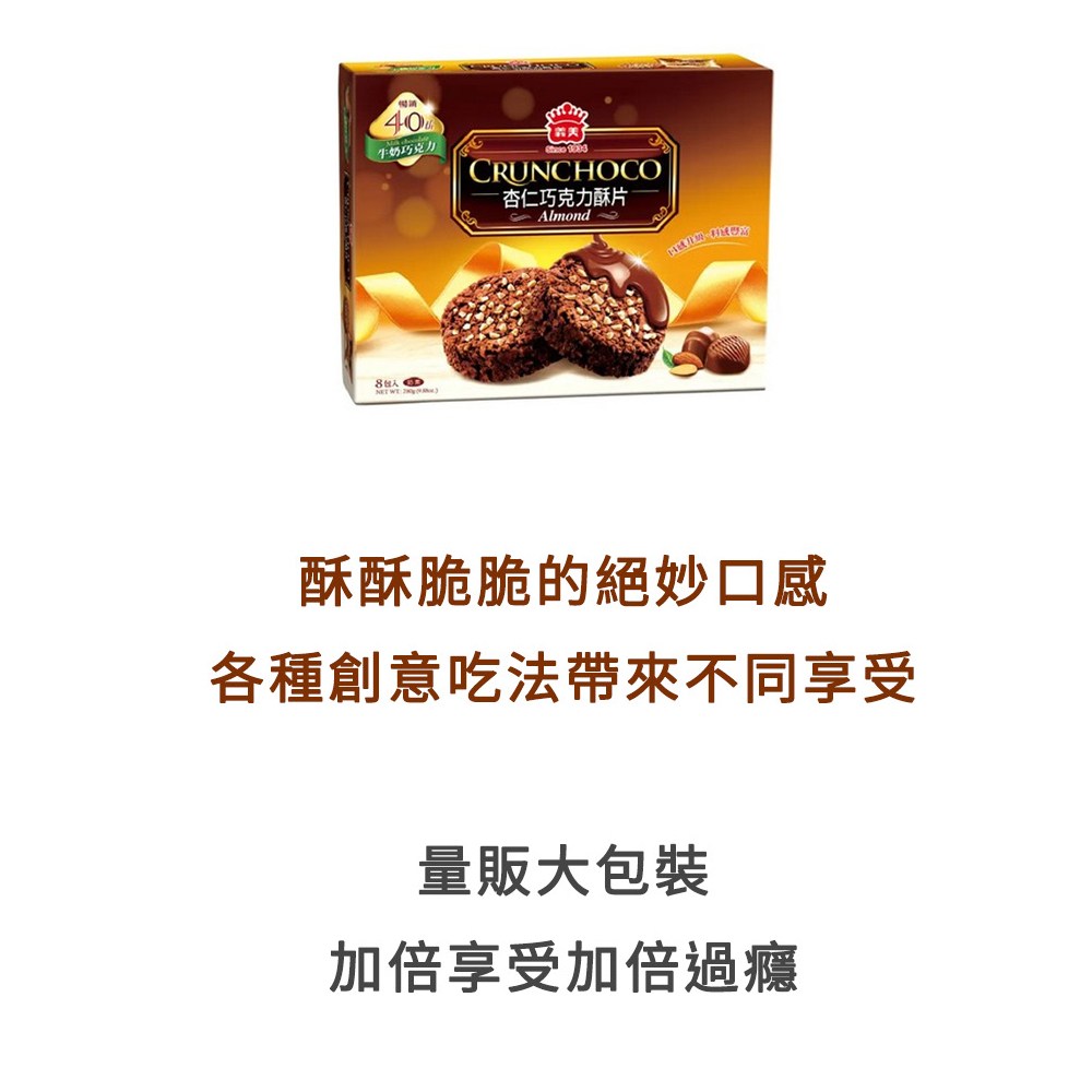 - 濃郁巧克力香氣四溢,搭配酥脆杏仁片,口感豐富,讓您一口接一口,停不下來的好滋味。