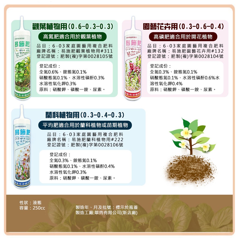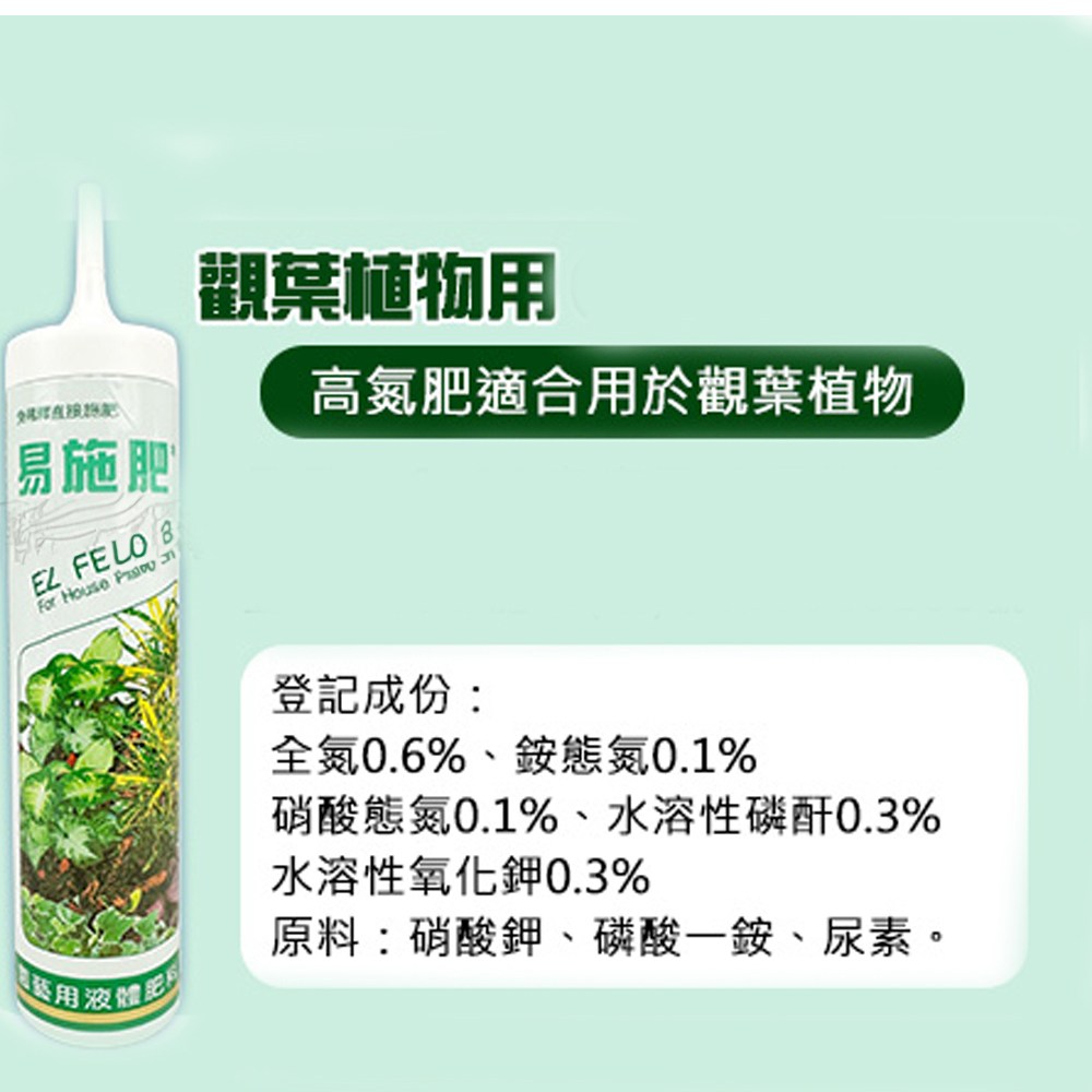 易施肥觀葉植物專用液體肥料,讓您的室內植物生長更茂盛!這款250ml的肥料,採用台灣肥料登記證配方,品質有保障。使用方便,無需稀釋,直接施用於盆栽土壤中即可,為觀葉植物提供均衡的養分,促進葉片翠綠,根系強健。富含氮、磷、鉀等植物所需元素,讓您的植物充滿活力。選擇易施肥,讓您的室內綠植煥發健康光彩,為家居增添更多生機。