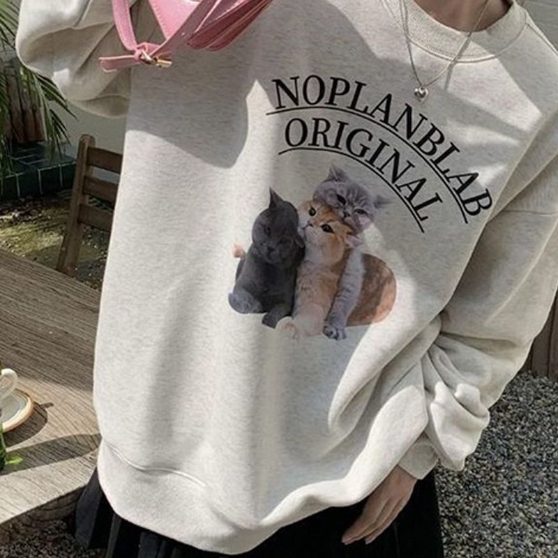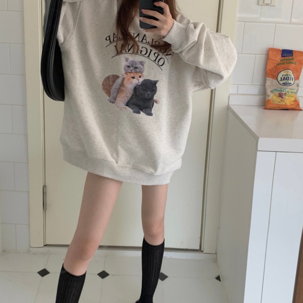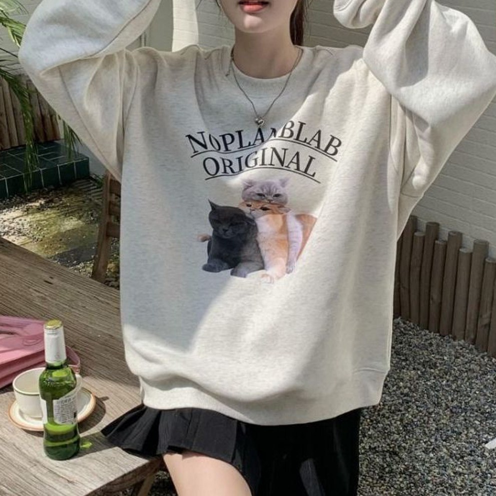 英式小貓咪印花大學T 棉+聚酯纖維, 2XL, 灰色