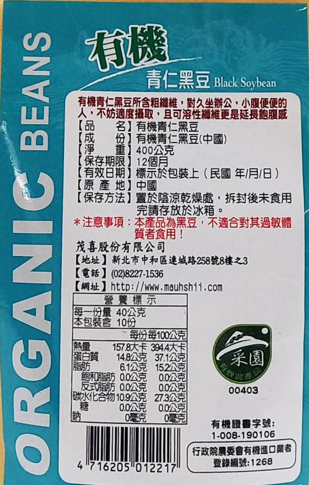 茂喜有機青仁黑豆,來自中國的400g包裝,給您帶來健康美味的選擇,有助於消化,還含有豐富的植物蛋白質,是素食者的理想選擇,確保無農藥殘留,讓您吃得安心。無論是煮粥、燉湯還是製作豆漿,都能為您的餐桌增添營養與美味,為您的健康生活加分。