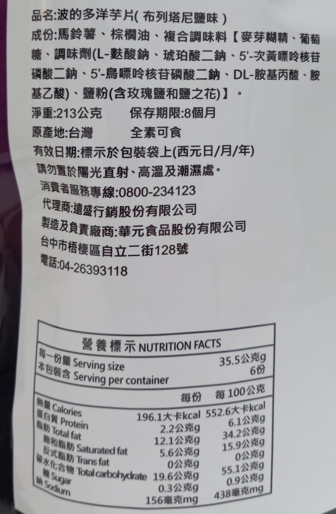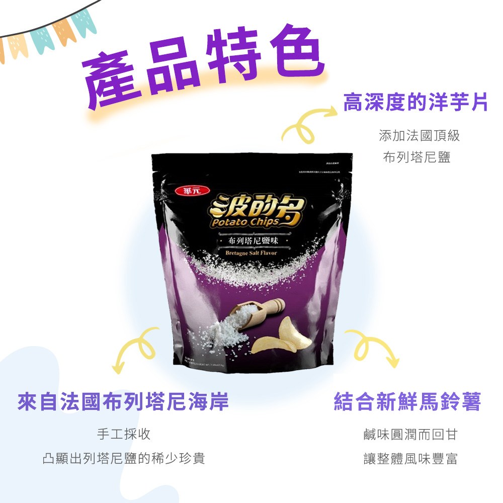 華元波的多布列塔尼鹽味洋芋片,嚴選新鮮馬鈴薯,搭配法國布列塔尼海鹽,每一口都散發著濃郁的海洋風味。酥脆的口感與恰到好處的鹹味,讓人忍不住一片接一片。213g大包裝,適合與家人朋友分享,無論是追劇、野餐或派對,都是最佳零食選擇。華元波的多,帶給您不一樣的味蕾享受,讓您隨時隨地都能品嚐到來自海洋的美味。