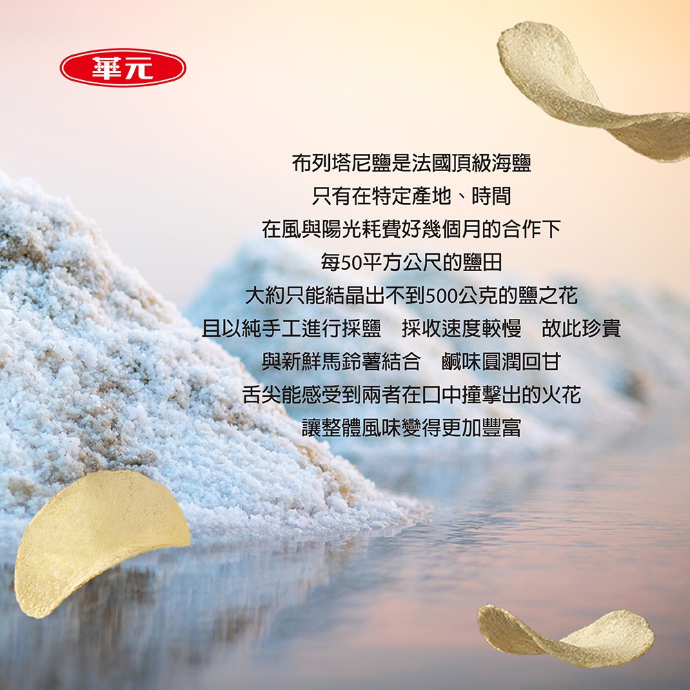 - 嚴選布列塔尼海鹽,鹹味適中,提升馬鈴薯的自然風味,讓您回味無窮。