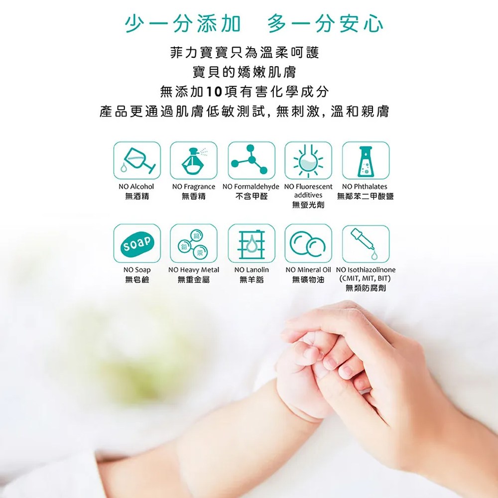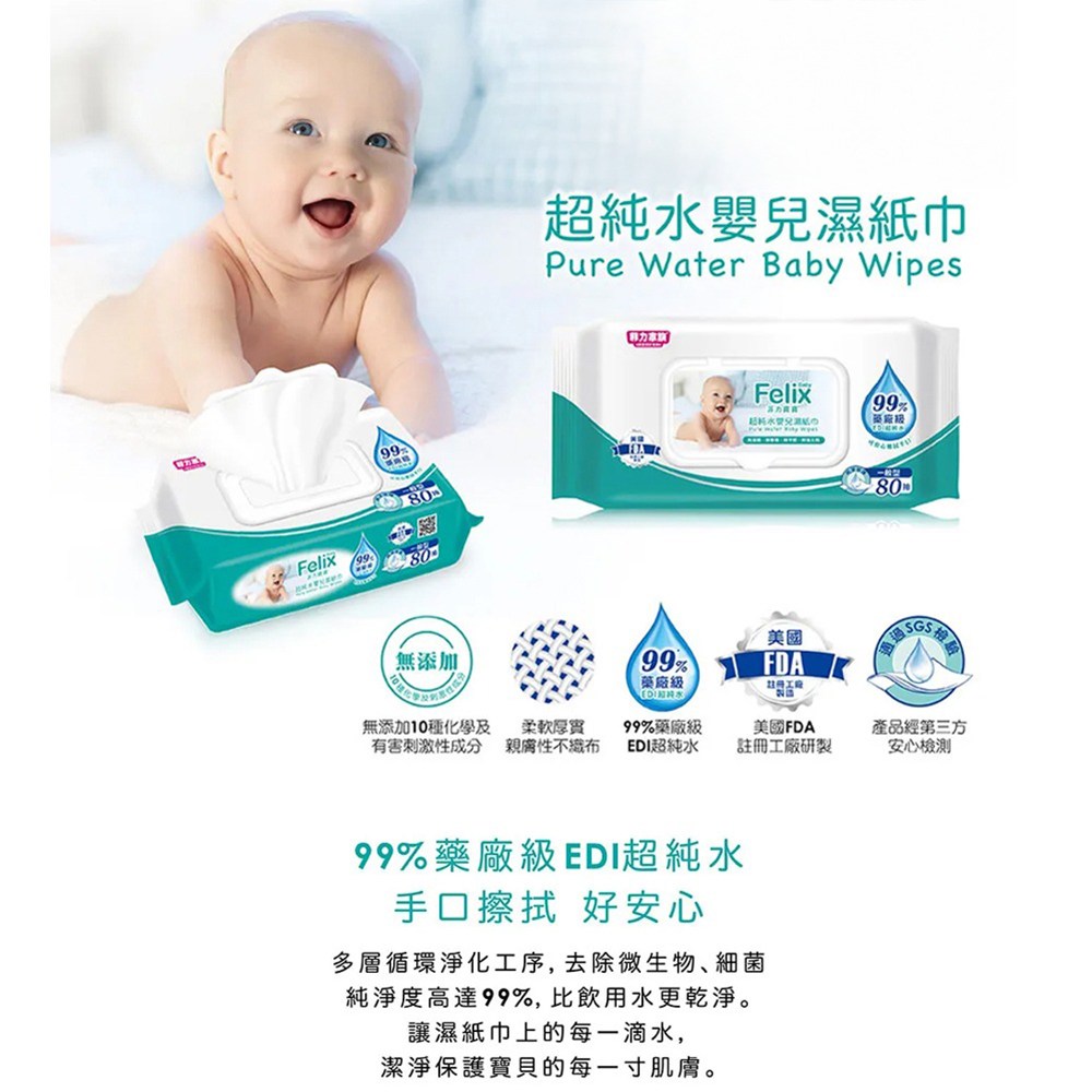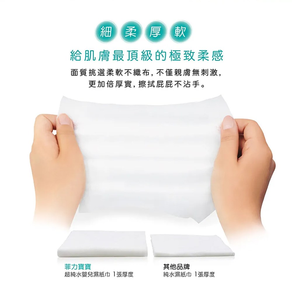 呵護寶寶嬌嫩肌膚,菲力寶寶純水嬰兒濕巾是您的安心之選。本產品採用99%藥廠等級EDI超純水,經過多層過濾淨化工藝,不含酒精、香精等10種有害化學成分,溫和不刺激,給寶寶最柔潤的呵護。掀蓋型設計,方便抽取,每包含80張濕巾,讓您隨時隨地都能輕鬆清潔。柔軟厚實的材質,親膚不織布,呵護寶寶的每一寸肌膚,讓您擦拭時更安心。