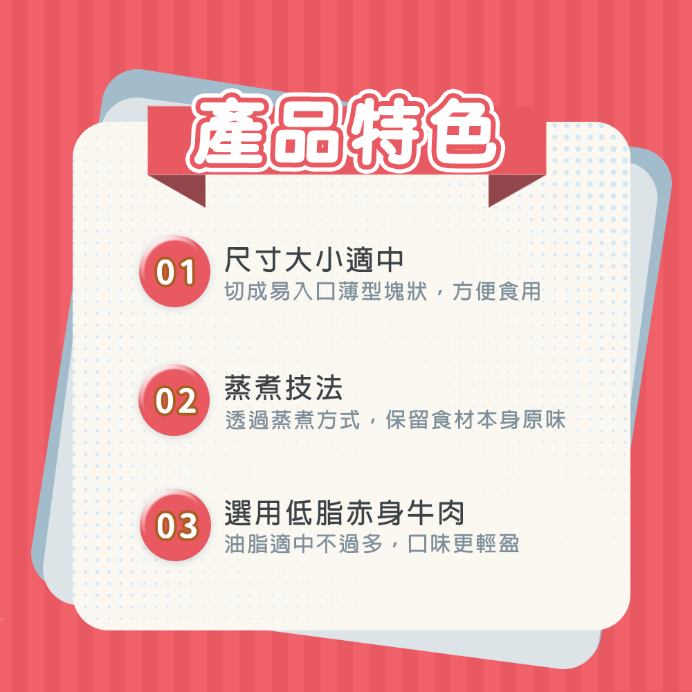- 食品特點: 切成易入口薄型塊狀,方便食用, 蒸煮技法,透過蒸煮方式,保留食材本身原味, 選用低脂赤身牛肉