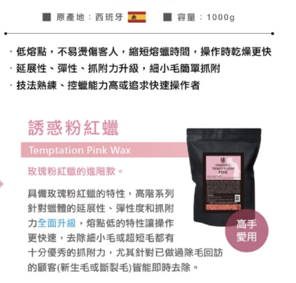 - 誘惑粉紅蠟具備優異的延展性和彈性,使操作更靈活,輕鬆去除身體各部位的毛髮。