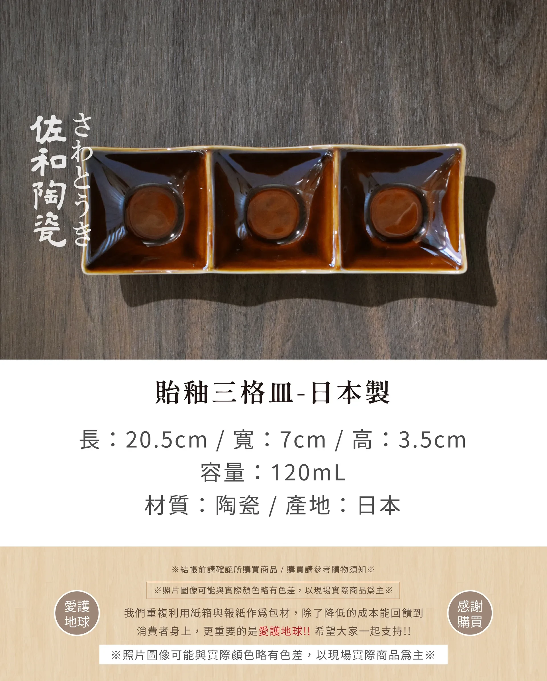 佐和陶瓷 貽釉三格皿-日本製 長20.5cm 寬7cm 高3.5cm 容量120mL, 1個