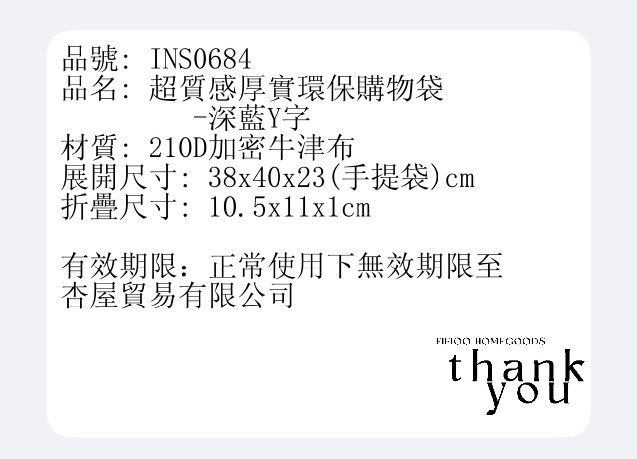 這款超質感厚實環保購物袋,尺寸為40 x 38公分,採用深藍Y字設計,不僅時尚美觀。採用210D加密牛津布材質,堅固耐用,承重力強,讓您安心購物。高密度防水,防潑水、防污,可水洗,易清潔,方便日常使用。精緻車縫線包邊,加強承重能力,更耐用。可摺疊收納,方便攜帶,是您外出購物的理想選擇。