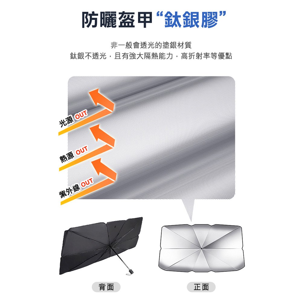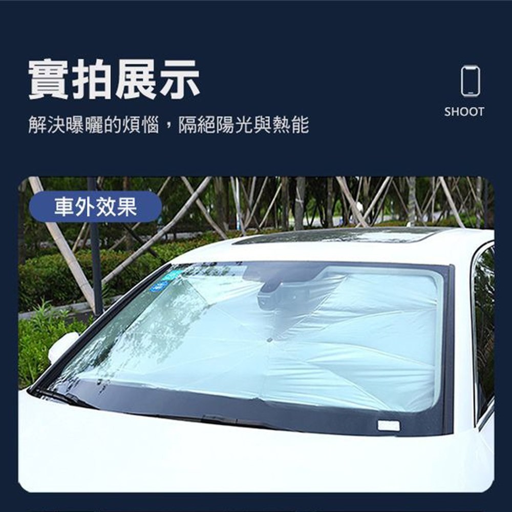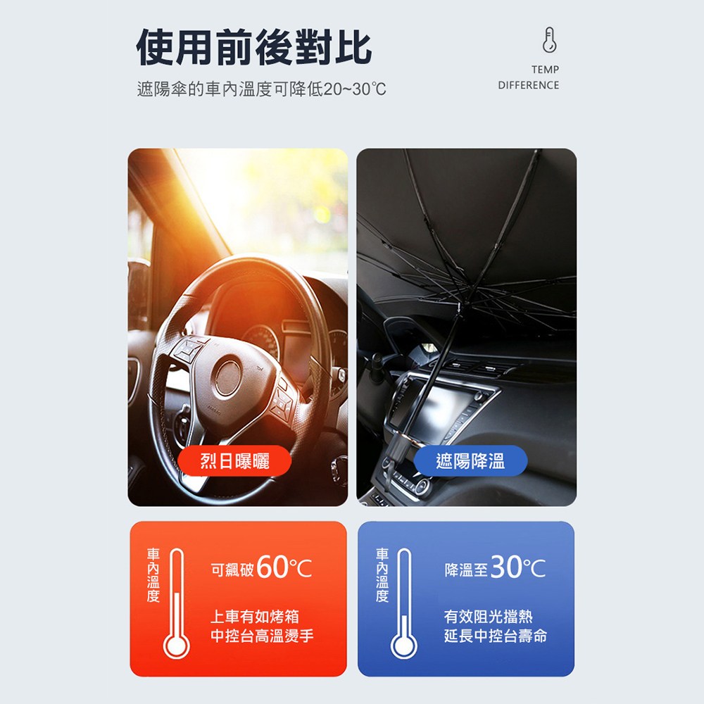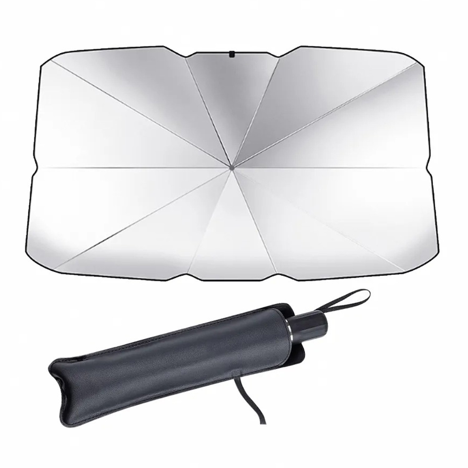 汽車前檔防曬隔熱遮陽傘,採用傘式設計,輕鬆展開即可有效阻擋陽光,降低車內溫度20-30°C,讓您不再受烈日曝曬之苦。材質選用電鍍黑鋼骨、碰擊布及鈦銀膠,堅固耐用且隔熱效果極佳。傘骨採用加粗十骨設計,更加牢固穩定,不易變形。收納方便,不佔空間,附贈精美皮套,讓您的愛車隨時保持涼爽舒適。