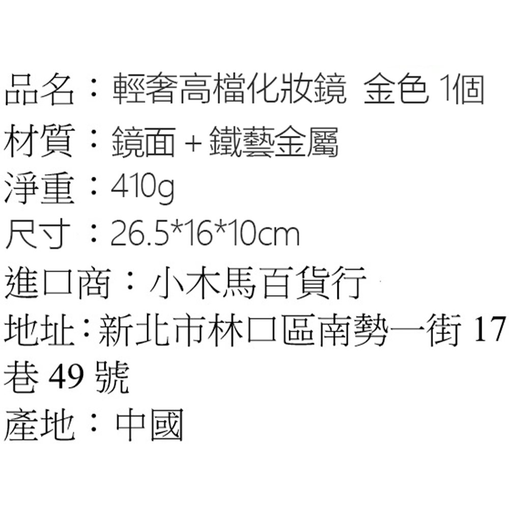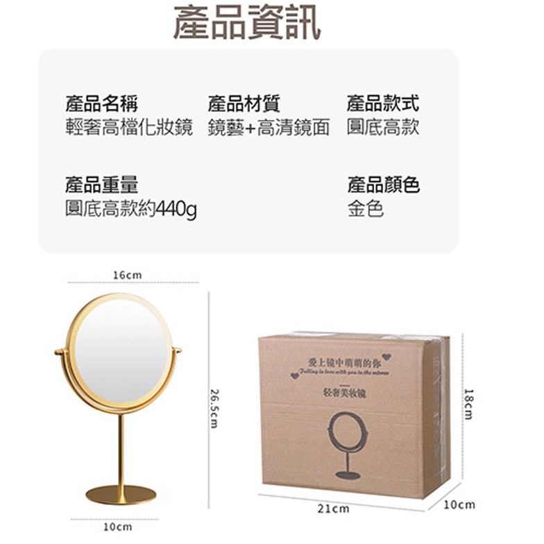 這款輕奢高檔金色化妝鏡,是您化妝台上的完美選擇。金色鏡面設計,增添奢華感,讓您在化妝時也能享受精緻生活。桌面立鏡可自由調整角度,清晰呈現妝容細節,打造完美妝容。輕巧設計方便移動,讓您隨時隨地都能輕鬆化妝。簡約風格,輕鬆融入各種居家風格,展現您的獨特品味。