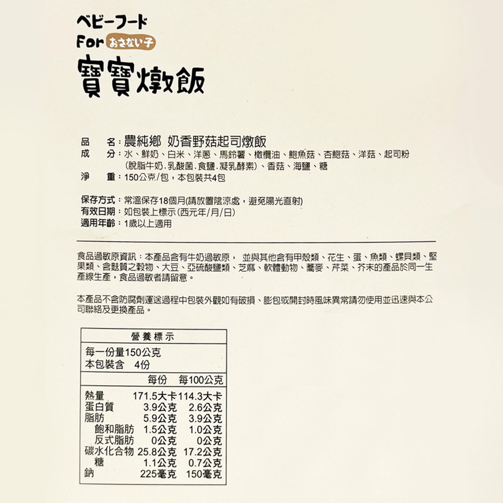- 嚴選多種菇類搭配,口感豐富,讓寶寶享受美味的同時,攝取多種營養。