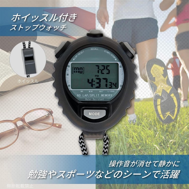 這款專業級多功能電子碼錶是您運動訓練、賽事計時或專心學習的理想夥伴。它提供高達1/100秒的精準計時,並具備60組圈數與分段時間記憶、倒數計時及日曆時鐘等多種實用功能。大螢幕設計讓數字清晰易讀,搭配防滑耐用的外殼,即使在激烈活動中也能輕鬆操作。具備生活防水功能,無懼汗水或雨水侵擾,確保性能穩定。更貼心的是,此碼錶附帶高音頻口哨,並可切換至靜音模式,讓您在圖書館等安靜環境中也能無聲操作,是教練、運動員與學生的絕佳選擇。