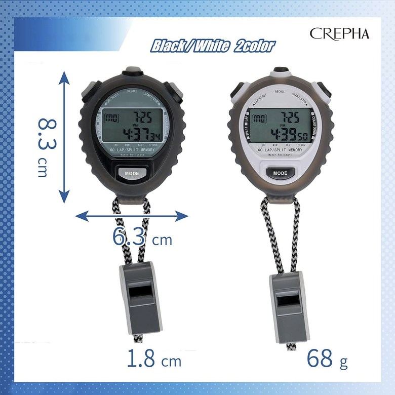 這款CREPHA專業多功能運動秒錶是您訓練、教學或計時需求的理想夥伴。擁有高精準度至1/100秒的計時功能,並可儲存多達60組的單圈與分段時間記憶,讓您精確掌握每個關鍵時刻。清晰的大螢幕三排數位顯示,能同時呈現總時間、分段及單圈成績,數據讀取毫不費力。貼心設計的靜音模式,可關閉按鍵音,適用於需要安靜的場合;生活防水功能則能應對運動時的汗水或雨天。產品附有實用掛繩與高音哨,不僅方便攜帶,更整合了教練與裁判的必備工具,無論是體育賽事、健身訓練還是日常計時都非常實用。