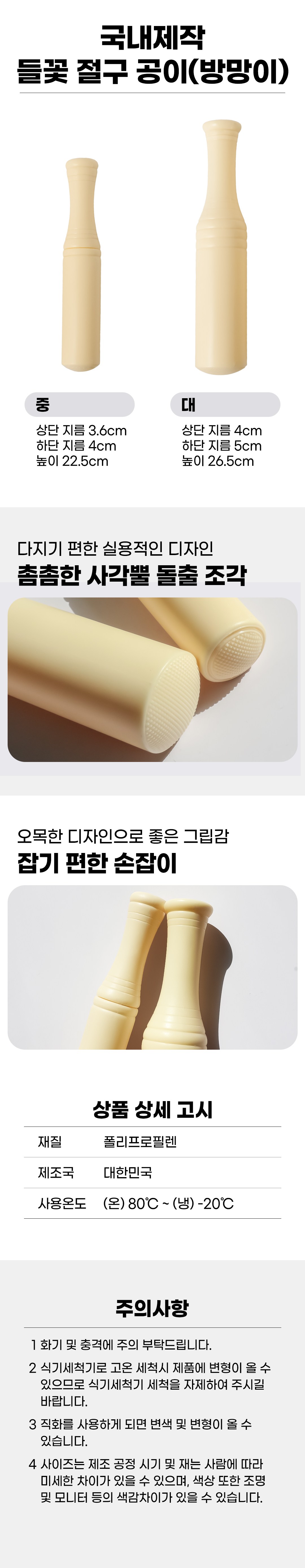 野花臼球2種組,包含中、大兩種尺寸,能滿足您多樣的烹飪需求。獨特的凹形手柄設計,提供絕佳的握感,讓您使用起來更加順手。密集的四角錐凸起雕刻,能更有效地搗碎食材,省時省力。無論是製作蒜蓉、香料粉,或是研磨其他食材,都能輕鬆完成。此產品由韓國製造,材質為聚丙烯,耐熱耐冷,使用安全。