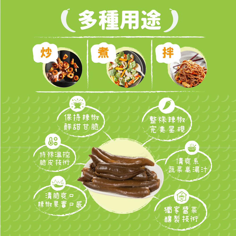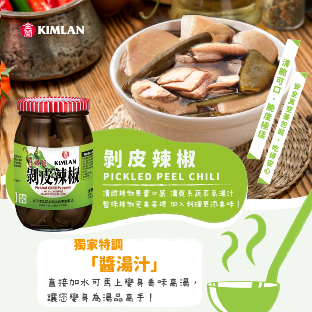 - 金蘭剝皮辣椒,口感清脆,香辣夠味,讓您輕鬆享受開胃好滋味,搭配稀飯或粥品,簡單又美味。