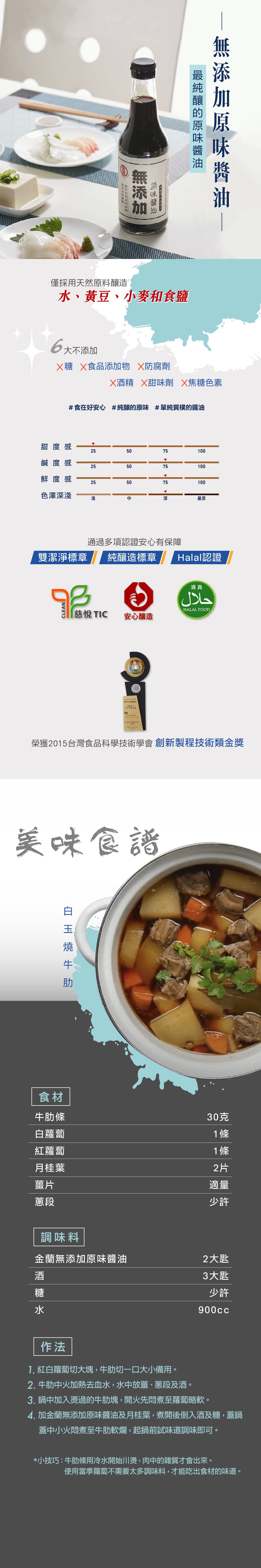 - 不含人工色素及香料,呈現醬油最原始的色澤與香氣,自然健康。