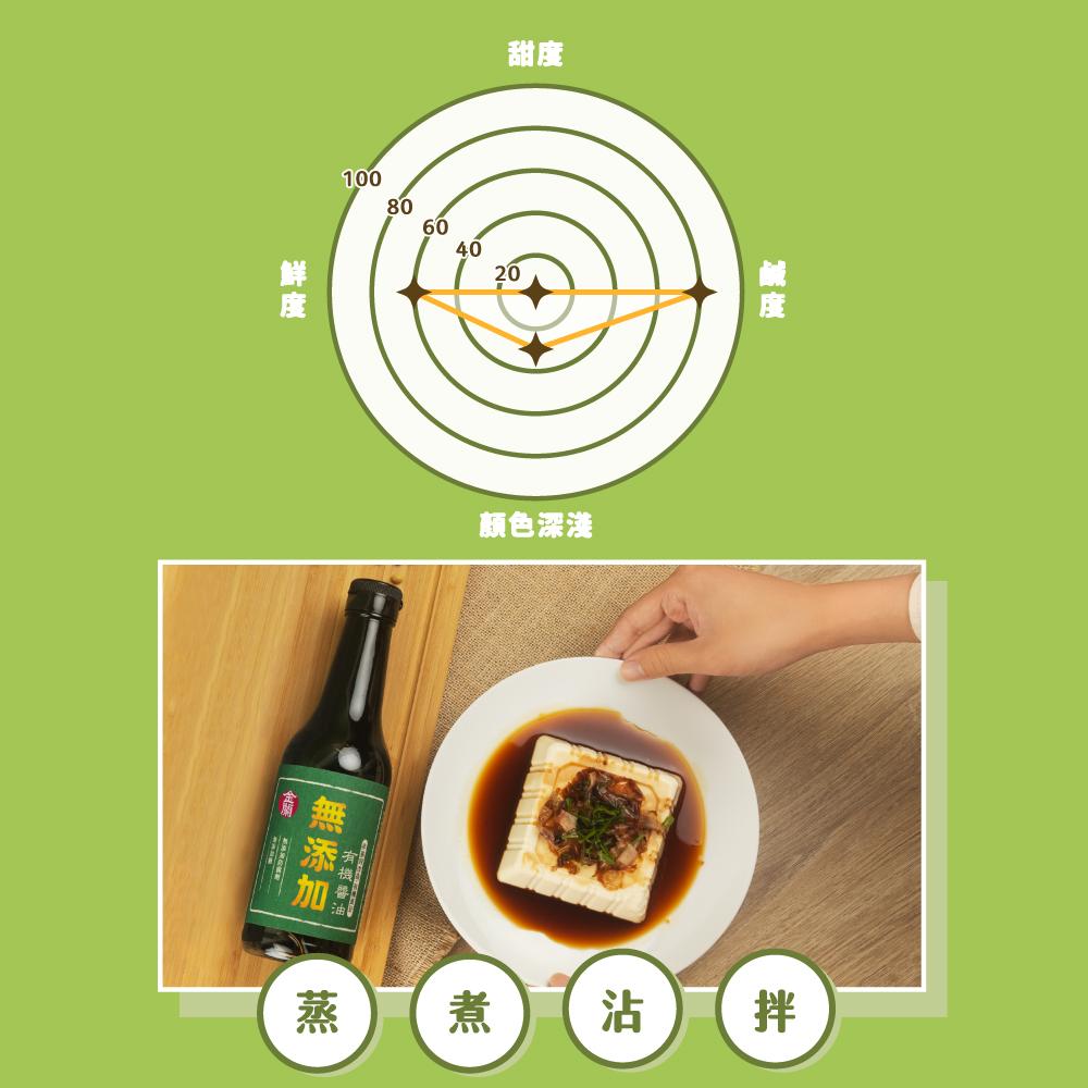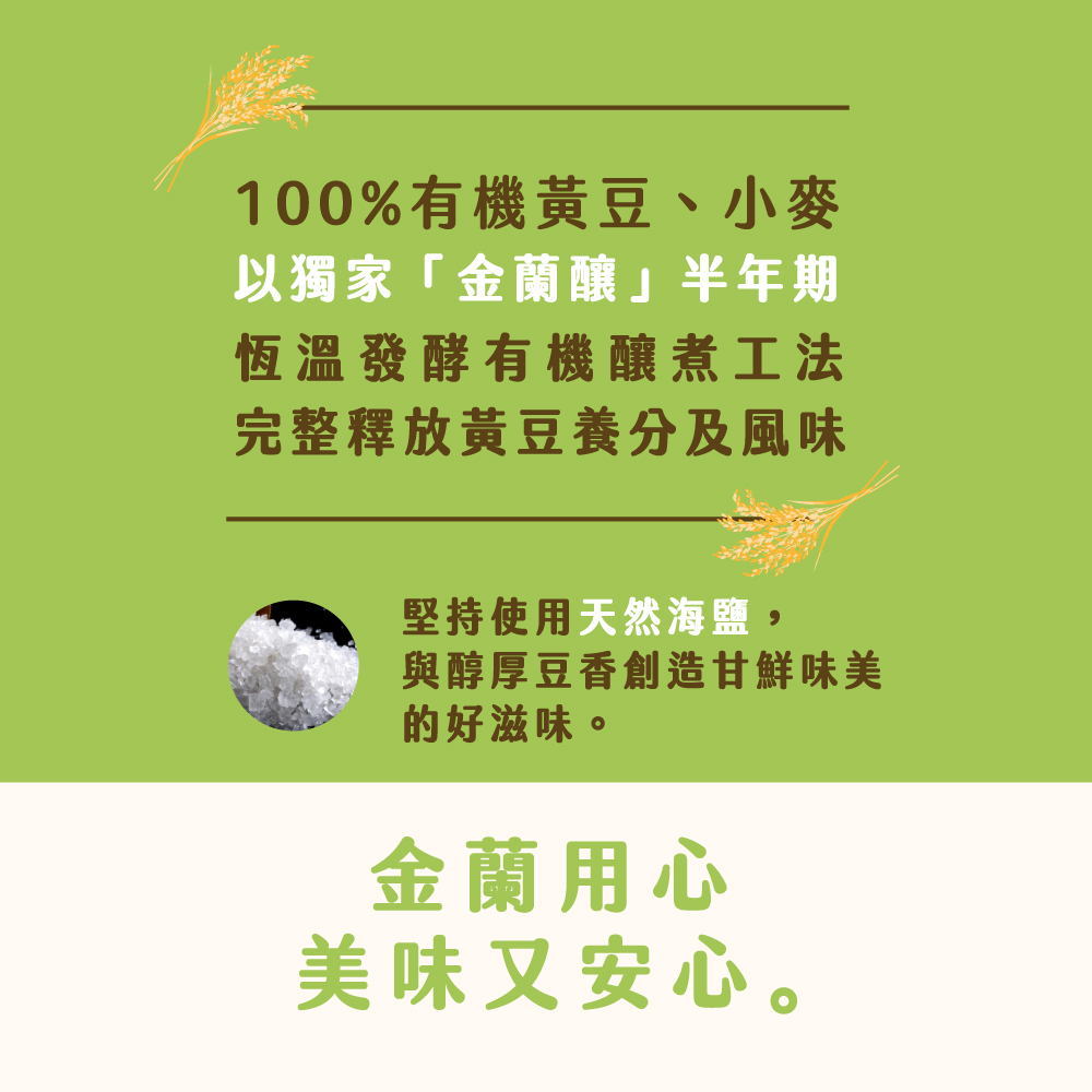 金蘭無添加醬油,遵循古法釀造工藝,不含防腐劑、人工色素及人工甘味劑等八大添加物,讓您安心享用純粹的醬油風味。經ISO22000、HACCP雙重認證,從原料到製程皆經過嚴格檢驗,確保每一滴醬油都符合最高品質標準。適合搭配各式料理,無論是簡單的豆腐或精緻的菜餚,都能提升食材的鮮美滋味。用最純粹的點滴,守護家人的健康,為您的餐桌增添一份安心與美味。