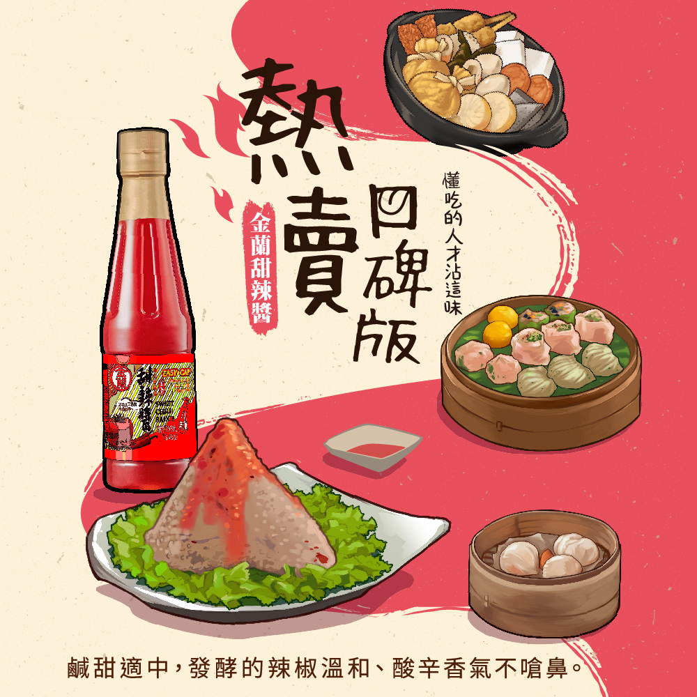 - 金蘭甜辣醬,口感滑順,甜中帶辣,讓您輕鬆享受多層次的味覺饗宴。
