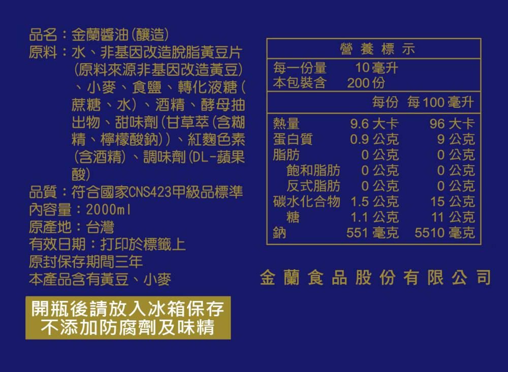 | 商品名稱 | KIMLAN 金蘭 醬油, 2L, 6瓶 | 原產地/國 | 台灣 |