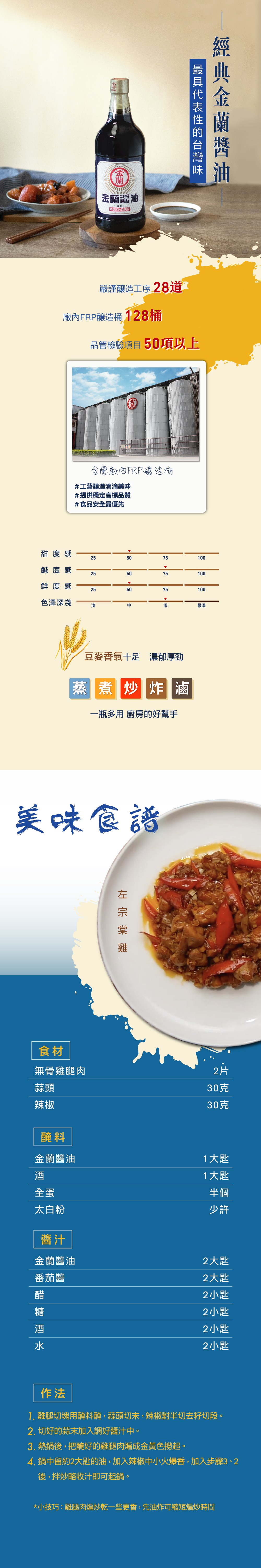 - 金蘭醬油是您廚房的得力助手,輕鬆調味,讓您快速做出美味佳餚。
