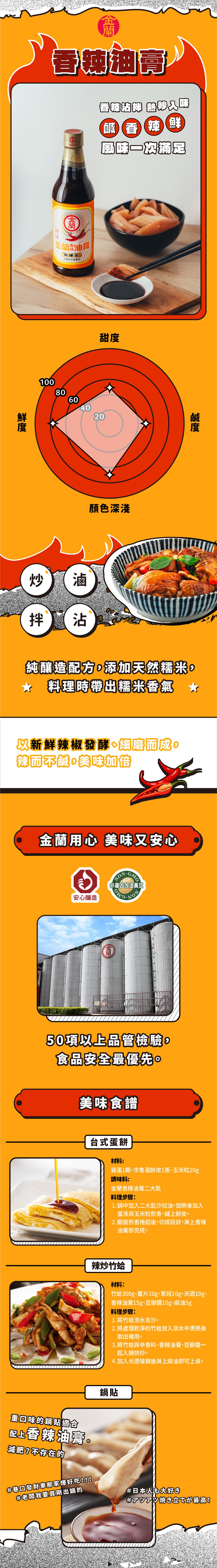 金蘭香辣油膏,為您的料理增添獨特風味。這款590ml的香辣油膏,採用非基因改造黃豆釀造,保證安心食用。其香辣滋味,無論是拌麵、沾醬、熱炒都非常適合,讓您輕鬆提升料理的層次感。金蘭品牌用心製作,經過多項品質檢驗,確保食品安全。原產地台灣,品質保證,讓您吃得美味又安心。快來體驗金蘭香辣油膏帶來的味蕾享受吧!