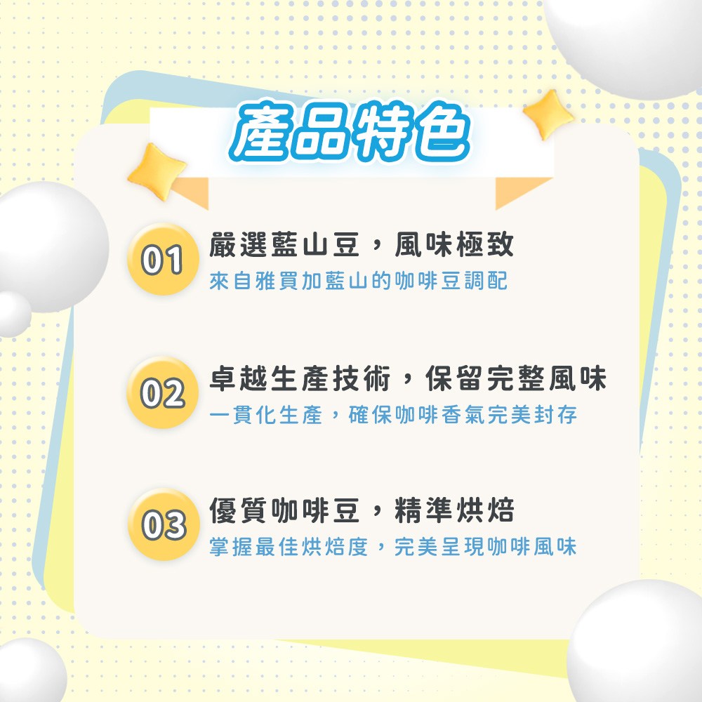 - 精選藍山咖啡豆調配,風味獨特,口感香醇濃郁,隨時隨地享受一杯高品質的咖啡,提神醒腦。