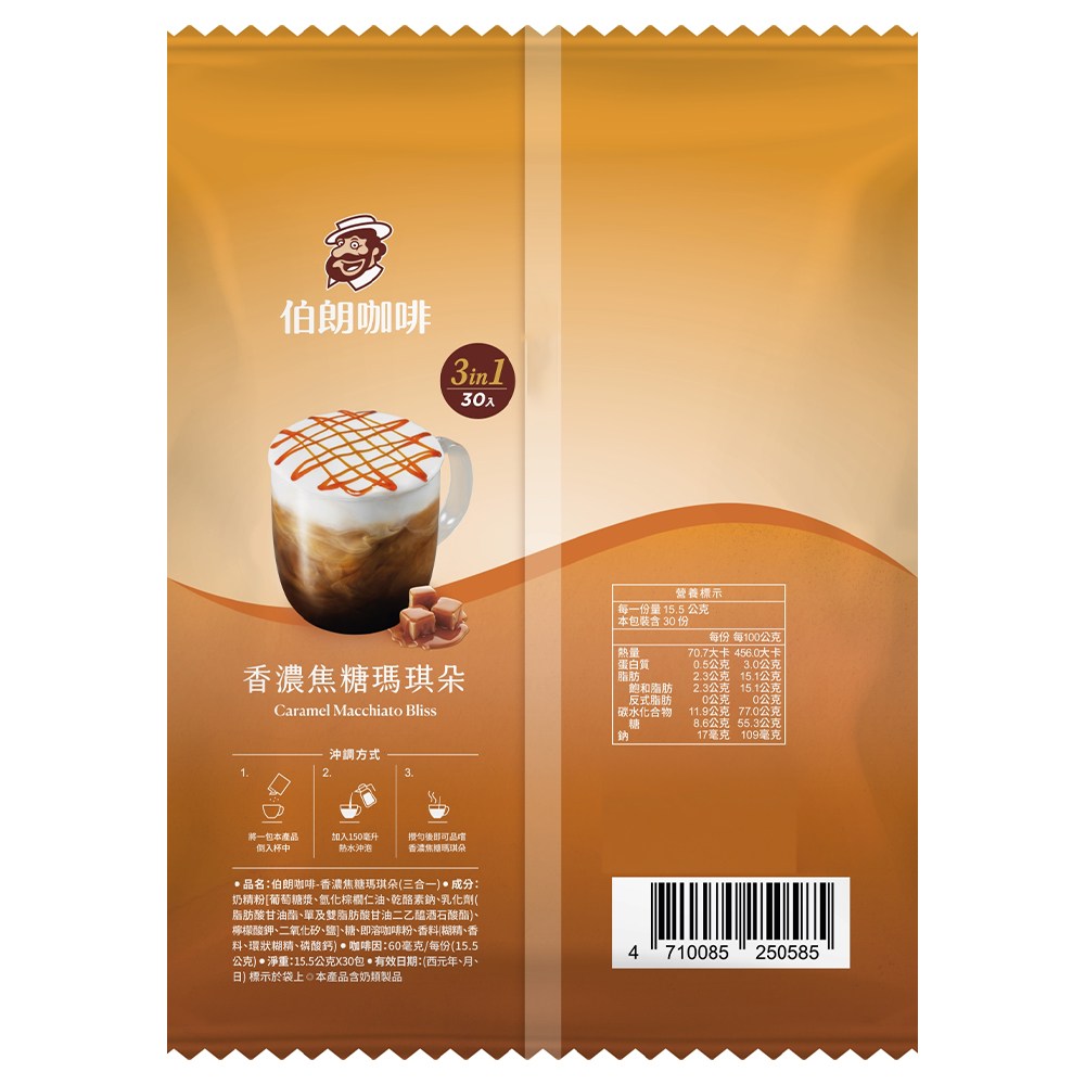 伯朗咖啡香濃焦糖瑪琪朵三合一,讓您隨時享受一杯幸福的咖啡。獨特比例融合咖啡、牛奶與楓糖風味,口感滑順,香氣濃郁。沖泡方式簡單方便,只需加入120-150毫升熱水攪拌均勻,即可立即享用。每包含有15.5克的完美份量,30入大包裝,適合各種場合。無論是工作日的早晨,或是悠閒的下午茶時光,都能輕鬆享受美好時光。