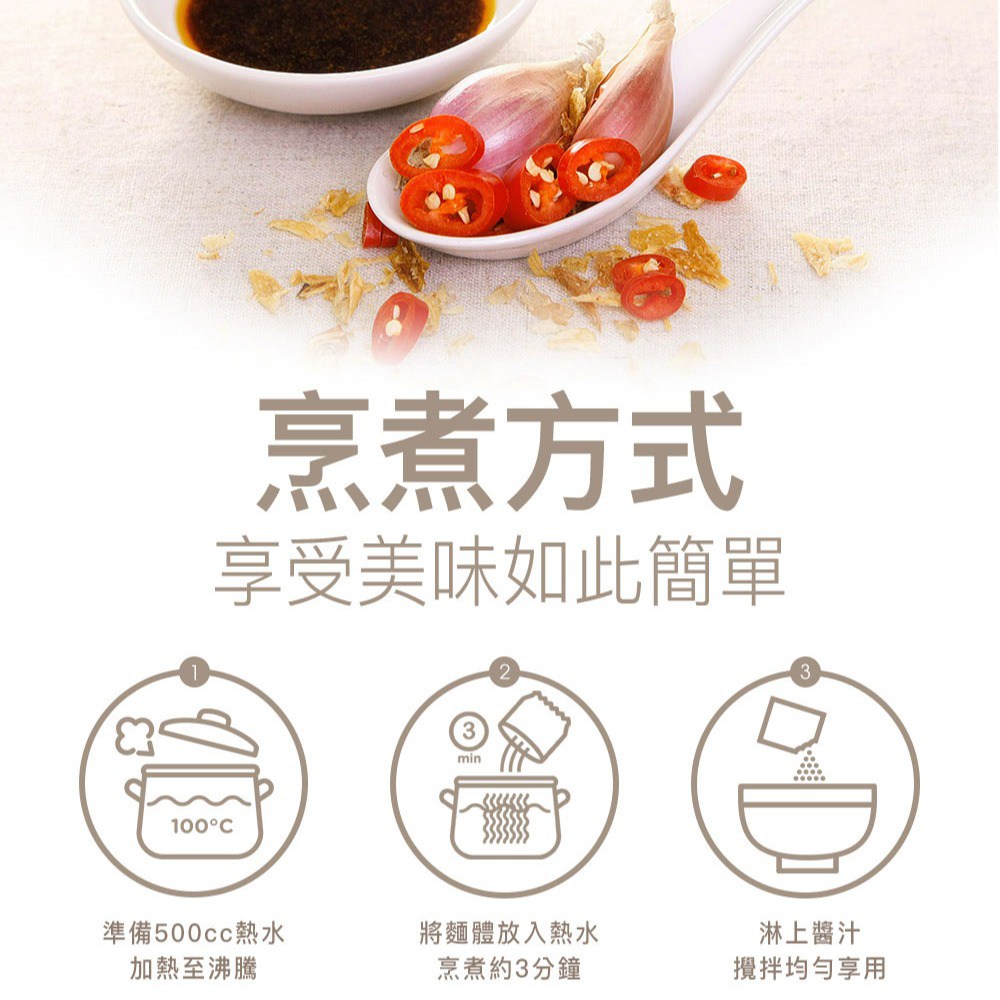 - - 麵條Q彈有嚼勁,搭配特製油蔥辣醬,香辣夠味,簡單快煮,在家也能輕鬆享受道地台灣美食。
