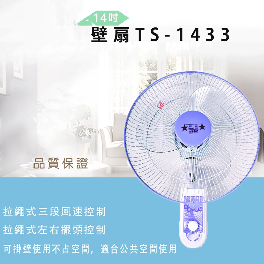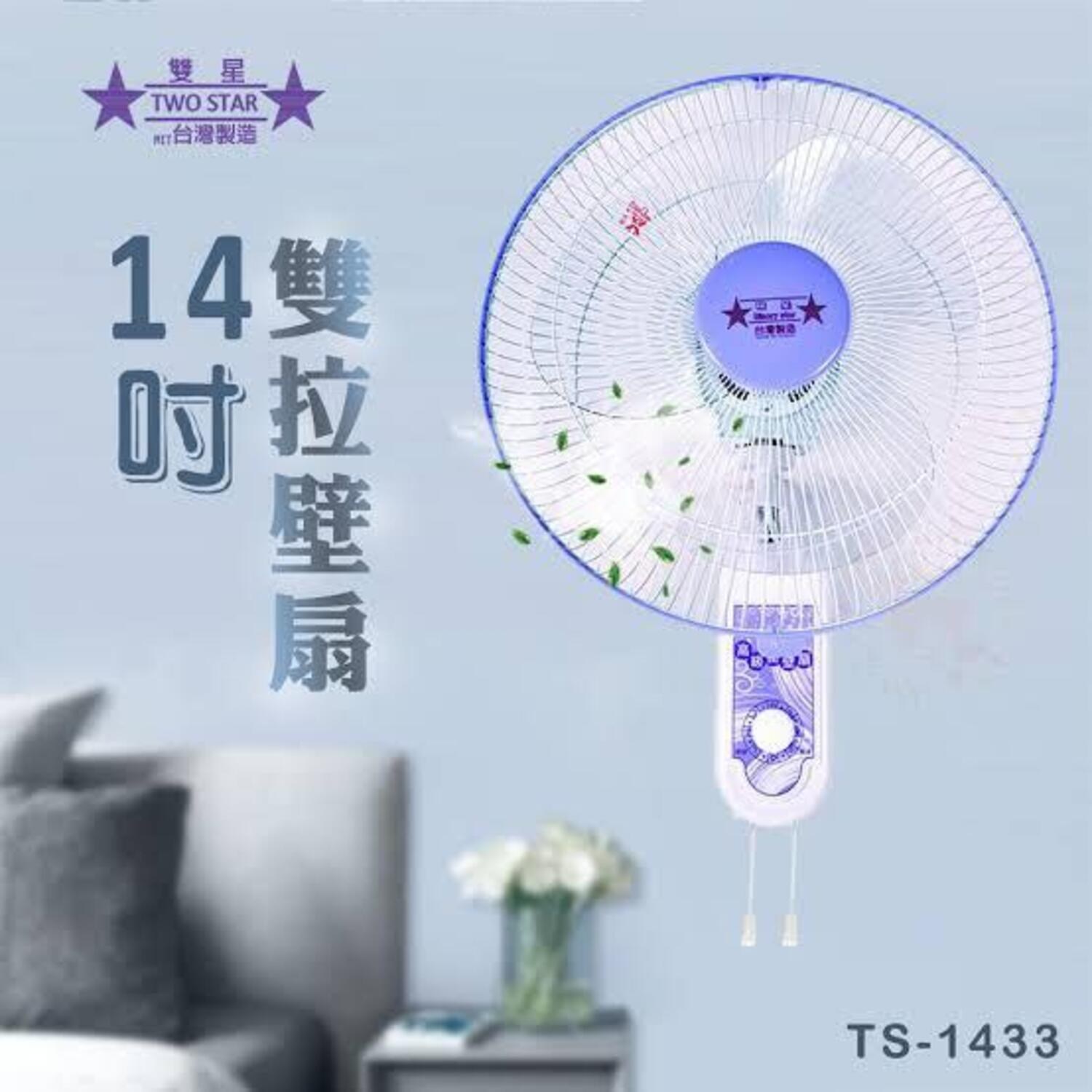 雙星牌14吋雙拉壁扇TS-1433,台灣製造,品質保證。這款壁扇採用14吋扇葉,能有效促進空氣循環,讓您在炎熱的夏日也能感到涼爽舒適。雙拉式設計,操作簡單方便,輕鬆調整風速。壁掛式設計節省空間,適合各種居家環境。110V電壓,60Hz頻率,使用安全可靠,重量僅3公斤,安裝簡便。