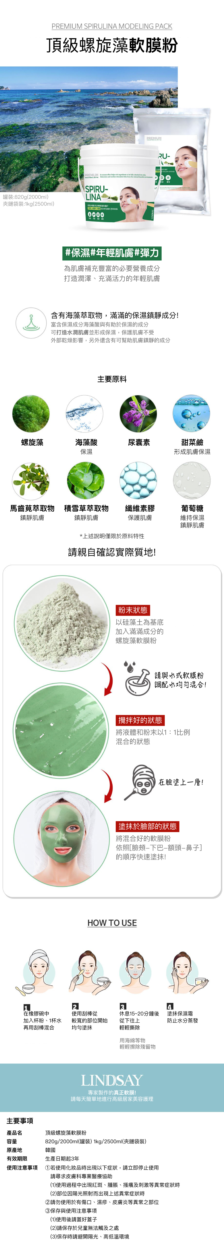 - 螺旋藻軟膜粉深層清潔毛孔,輕鬆去除污垢,讓肌膚自由呼吸,展現健康光澤。