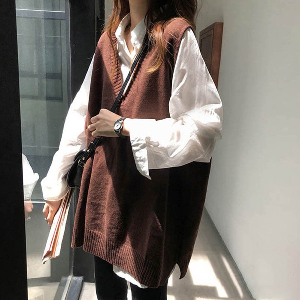 韓版落肩寬鬆長版大V領針織毛衣背心