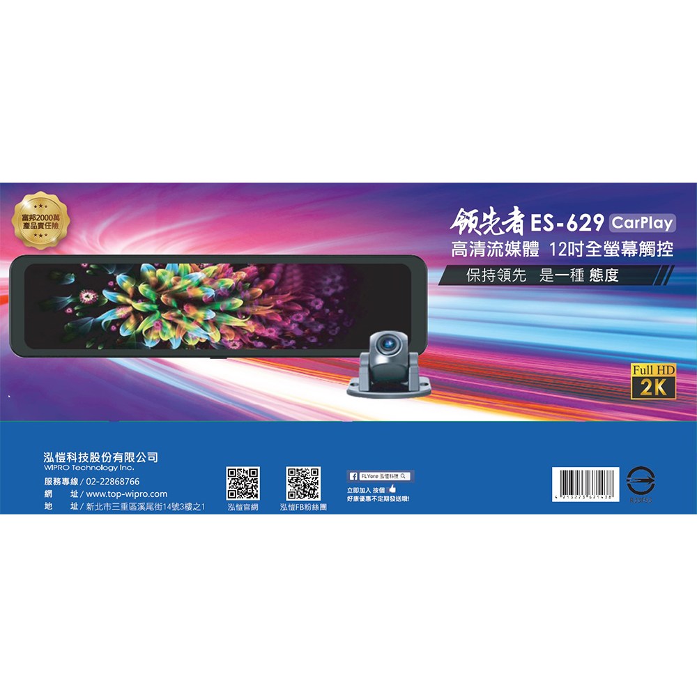 領先者CarPlay 2K高清流媒體後視鏡行車記錄器ES-629,結合了高清流媒體與無線CarPlay技術,為您的行車體驗帶來革命性的提升。12吋全螢幕觸控設計,操作直觀便捷,讓您輕鬆享受導航、音樂、電話等功能。2K超高清畫質,搭配寬動態影像技術,確保在各種光線條件下都能清晰記錄行車過程。此外,內建藍芽功能,可無線連接手機,擴展更多車載應用,讓您的愛車瞬間升級。