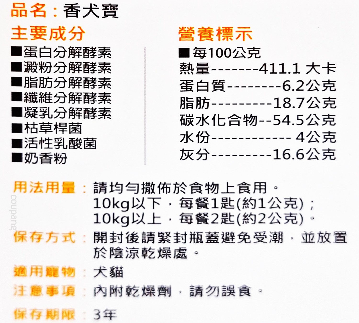 香犬寶是一款專為犬貓設計的腸道保健營養補充品。本產品富含多種消化酵素,如蛋白分解酵素、澱粉分解酵素、脂肪分解酵素等,有助於分解食物中的蛋白質、澱粉和脂肪,促進營養吸收。此外,還添加了枯草桿菌和活性乳酸菌,維持腸道菌群平衡。每100克含有411.1大卡熱量,以及6.2克蛋白質、18.7克脂肪、54.5克碳水化合物等營養成分,為寵物提供均衡的營養支持。建議用法:10公斤以下犬貓,每日1匙(約1克);10公斤以上,每日2匙(約2克),均勻撒於食物上食用。