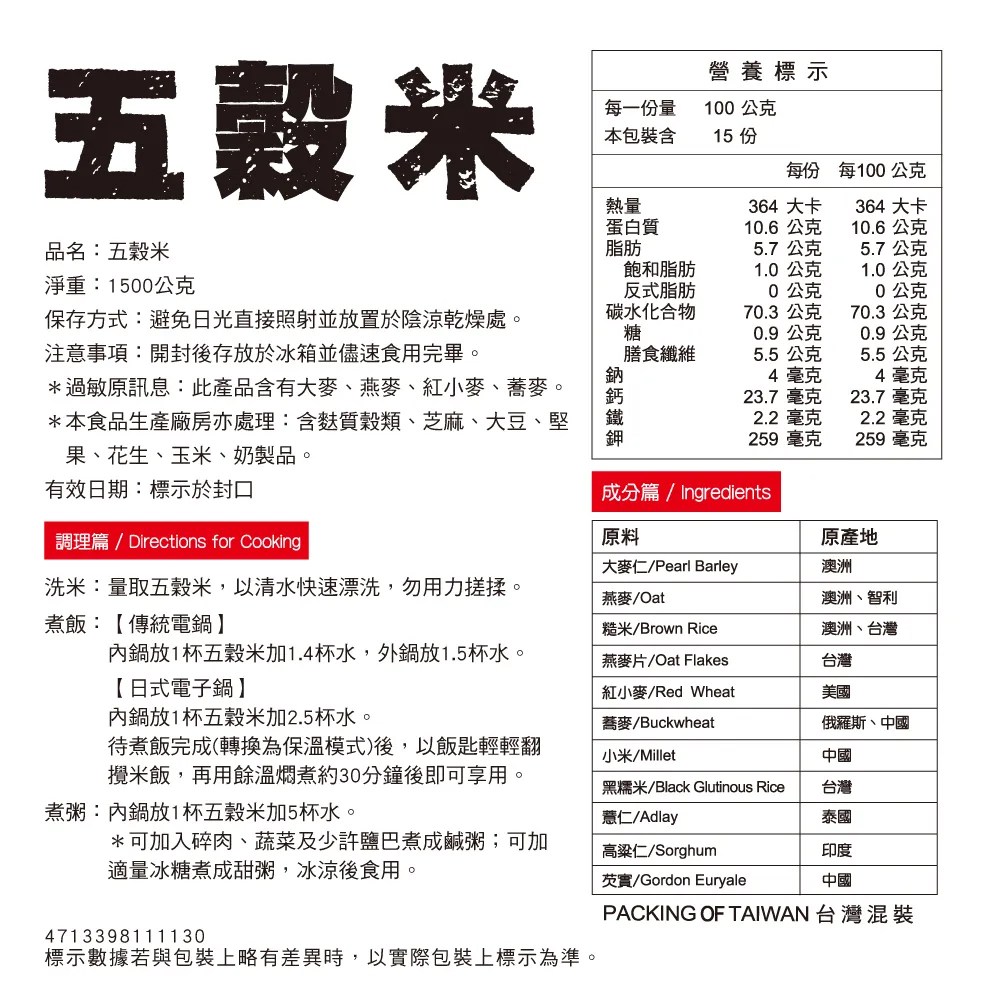- 五穀米易於消化吸收,適合全家大小,輕鬆享受健康美味。