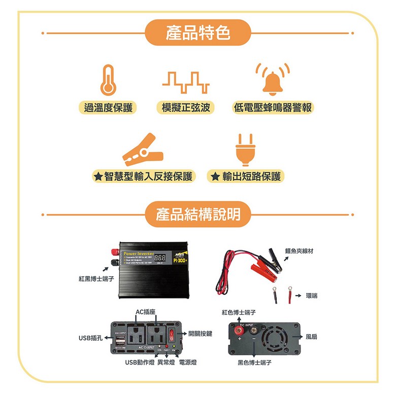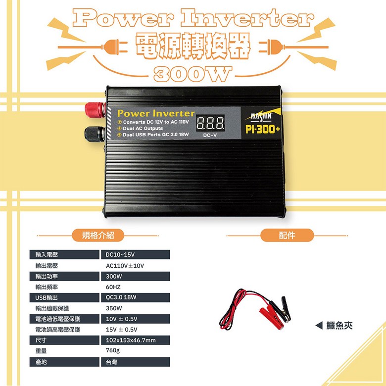 麻新電子 PI-300 模擬正弦波電源轉換器 12V 300W,車用電源轉換器,安全穩定,方便攜帶, 1個