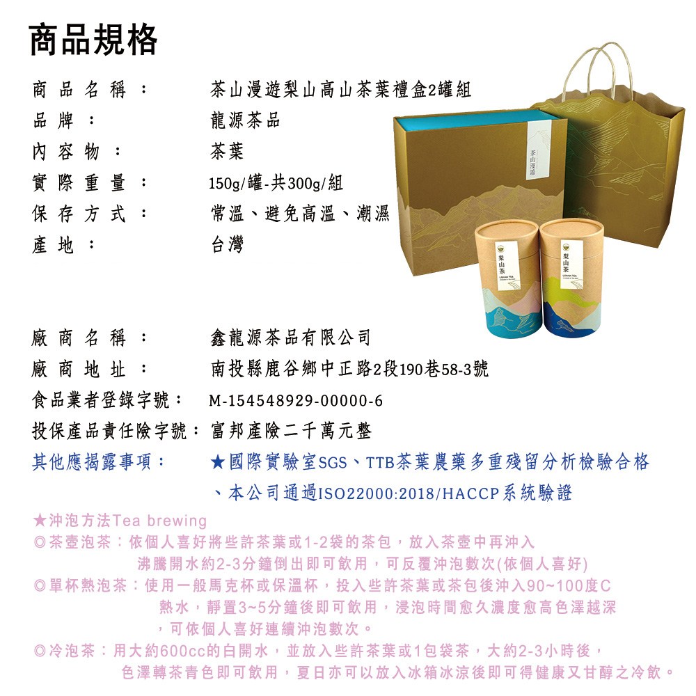 龍源茶品鑫龍源茶山漫遊梨山高山茶葉禮盒,嚴選台灣梨山高山茶葉,茶葉產自高海拔茶區,吸收天地精華,孕育出獨特風味。禮盒內含兩罐150g茶葉,附贈精美提袋,送禮自用兩相宜。茶湯色澤金黃明亮,入口滋味甘醇,香氣淡雅,回甘持久,讓您在品茗中感受高山茶的獨特魅力。無論是自用或送禮,都能展現您的品味與心意。通過多項檢驗認證,讓您安心品嚐。